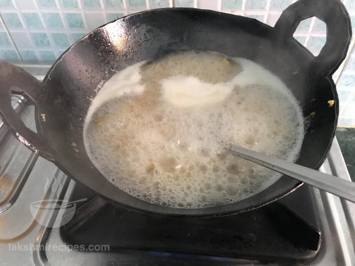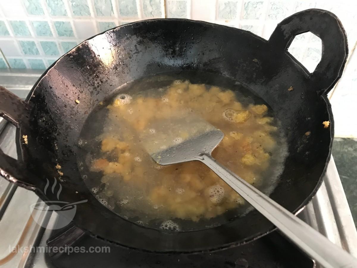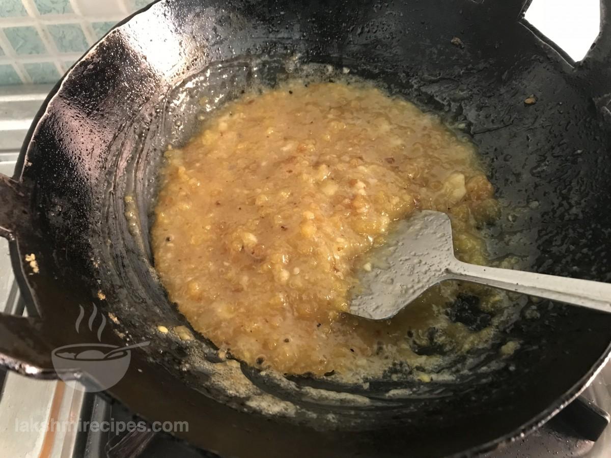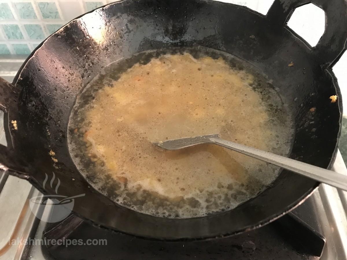 - Slowly the sugar will get dissolved and moong dal will soak up all the water and swell. (Remember, do not completely dry the water. The texture of the moong dal should be moist and not dry.)
