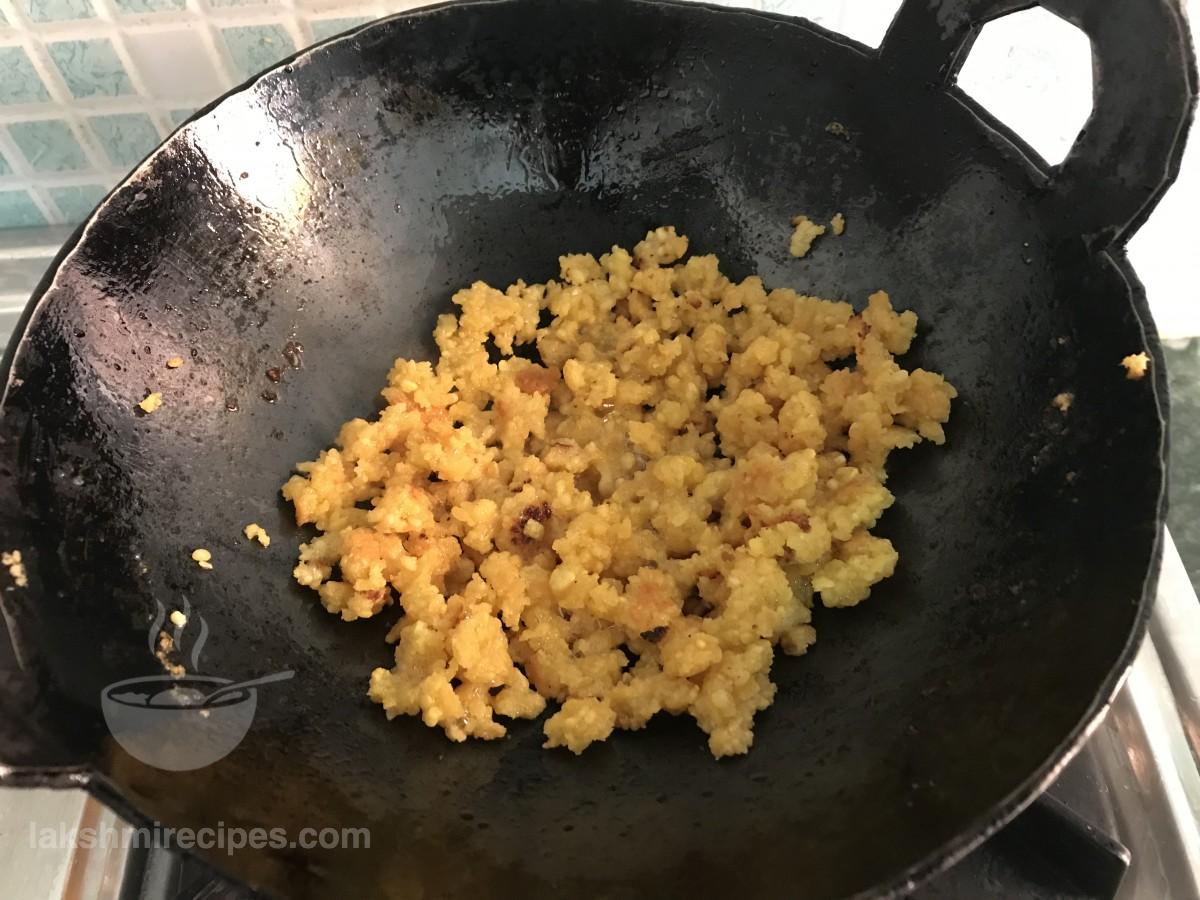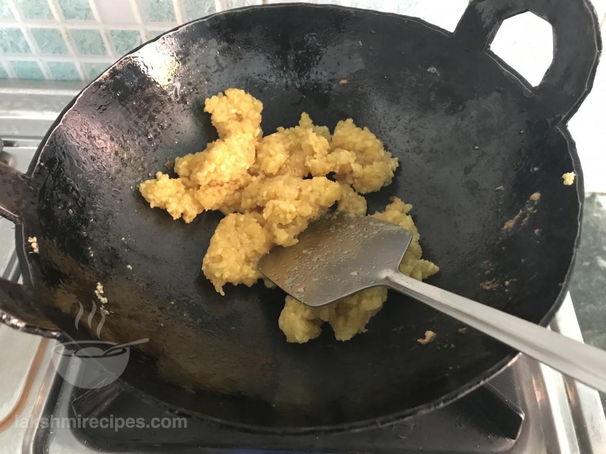 - Then add the coarsely ground Splitted and Dehusked Green Gram or Dhuli Moong Dal to it. Stir the dal from the base of the kadhai and cook it till the ghee begins to seperate from the cooking ingredient.