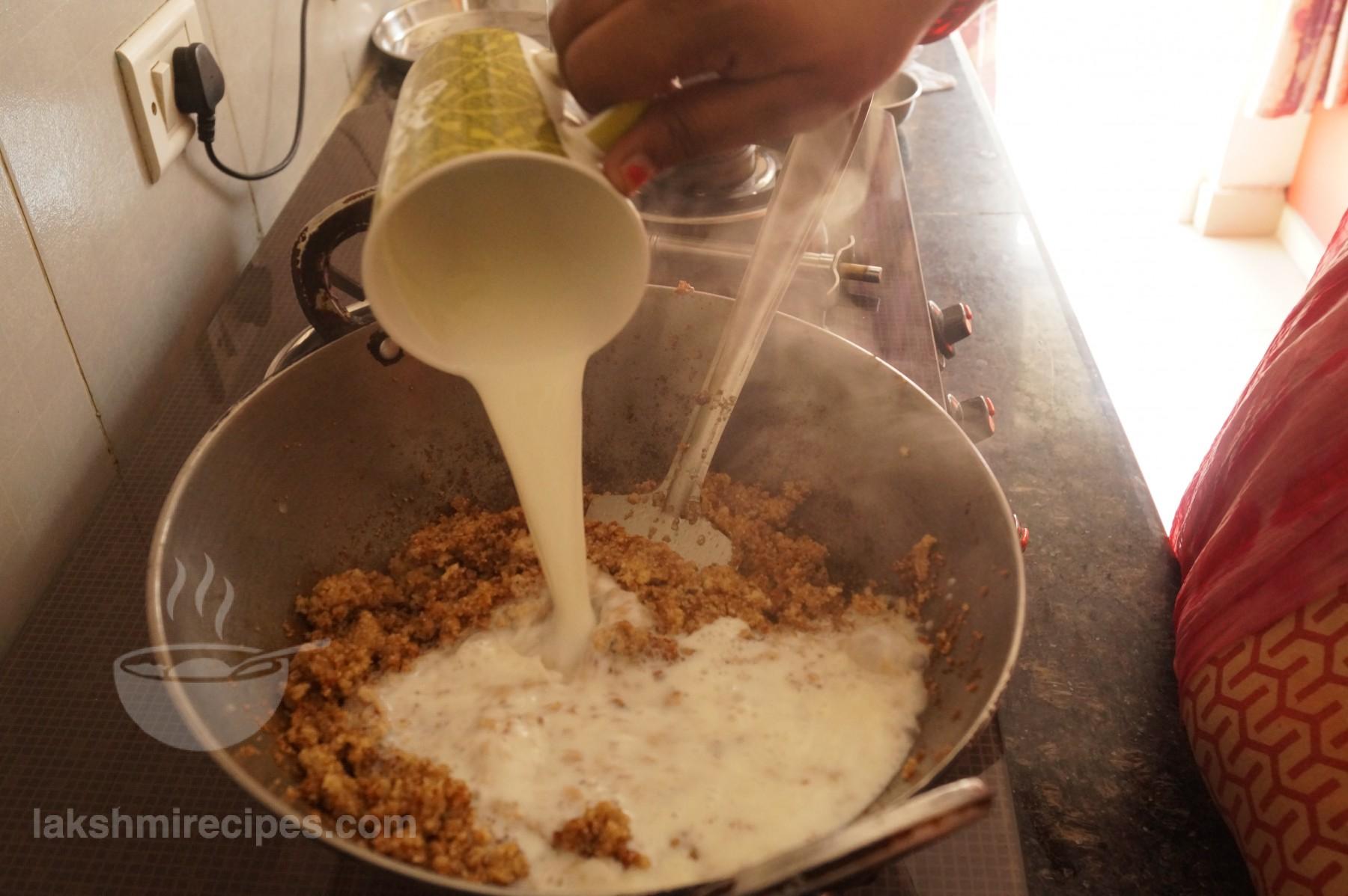 - Now add the milk to the kadhai, and increase the flame. Keep stirring till all the milk gets absorbed.