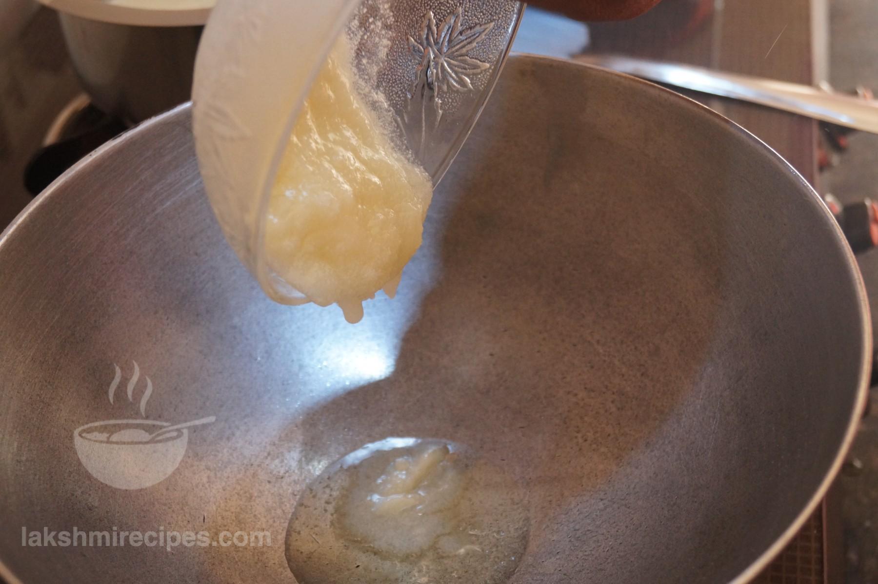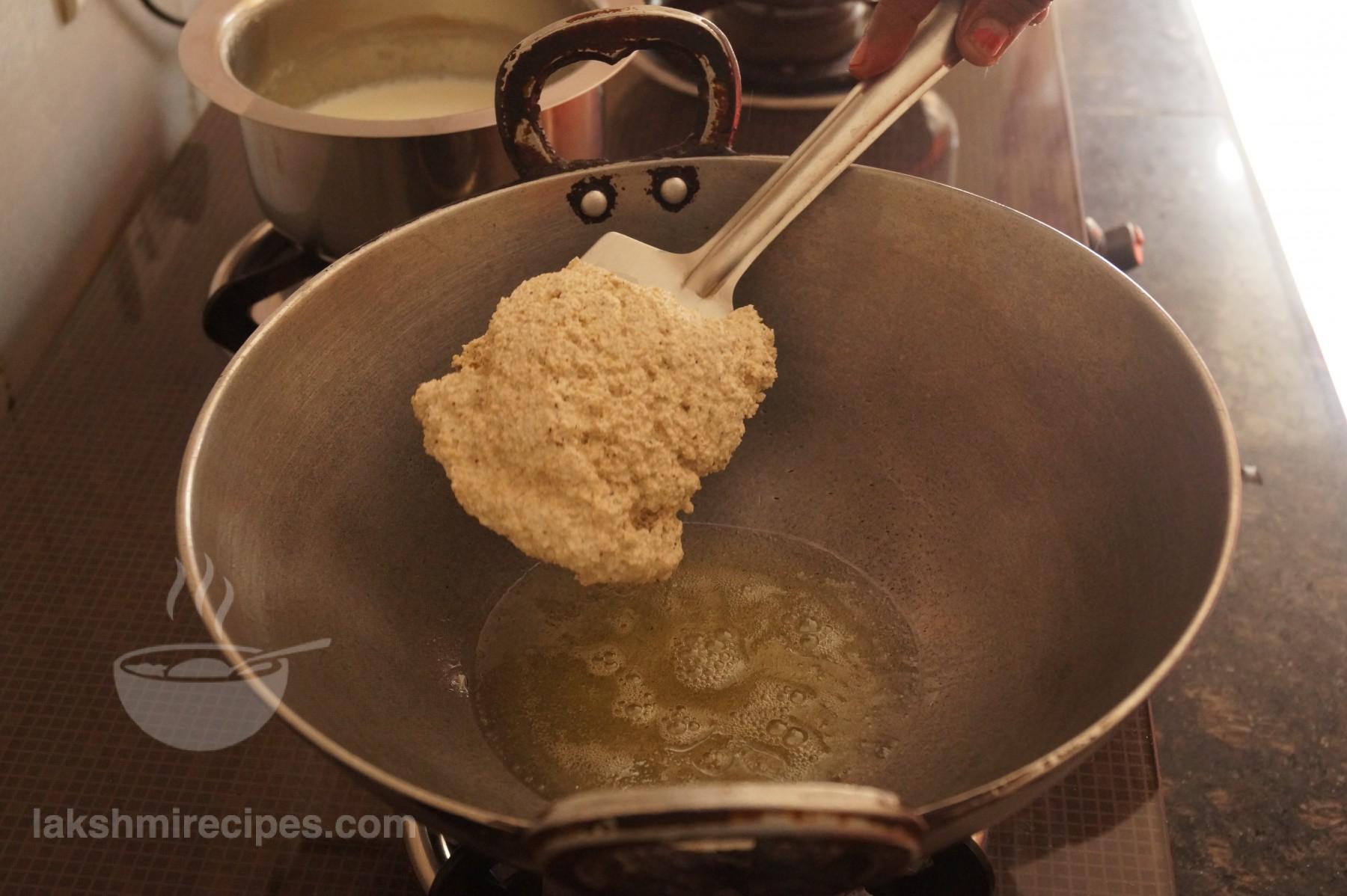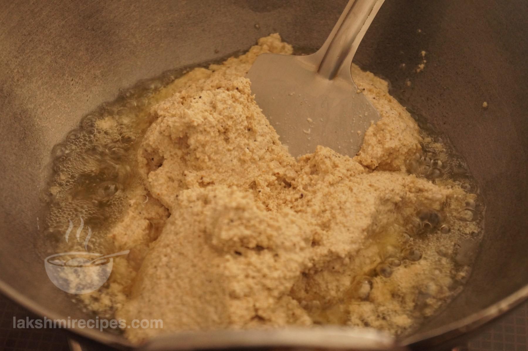 - अब एक मोटे तले की कढ़ाई में देसी घी गरम करें। कढ़ाई में खस-खस (या पोस्ता-दाना) क दरदरा पिसा हुआ पेस्ट डालें।