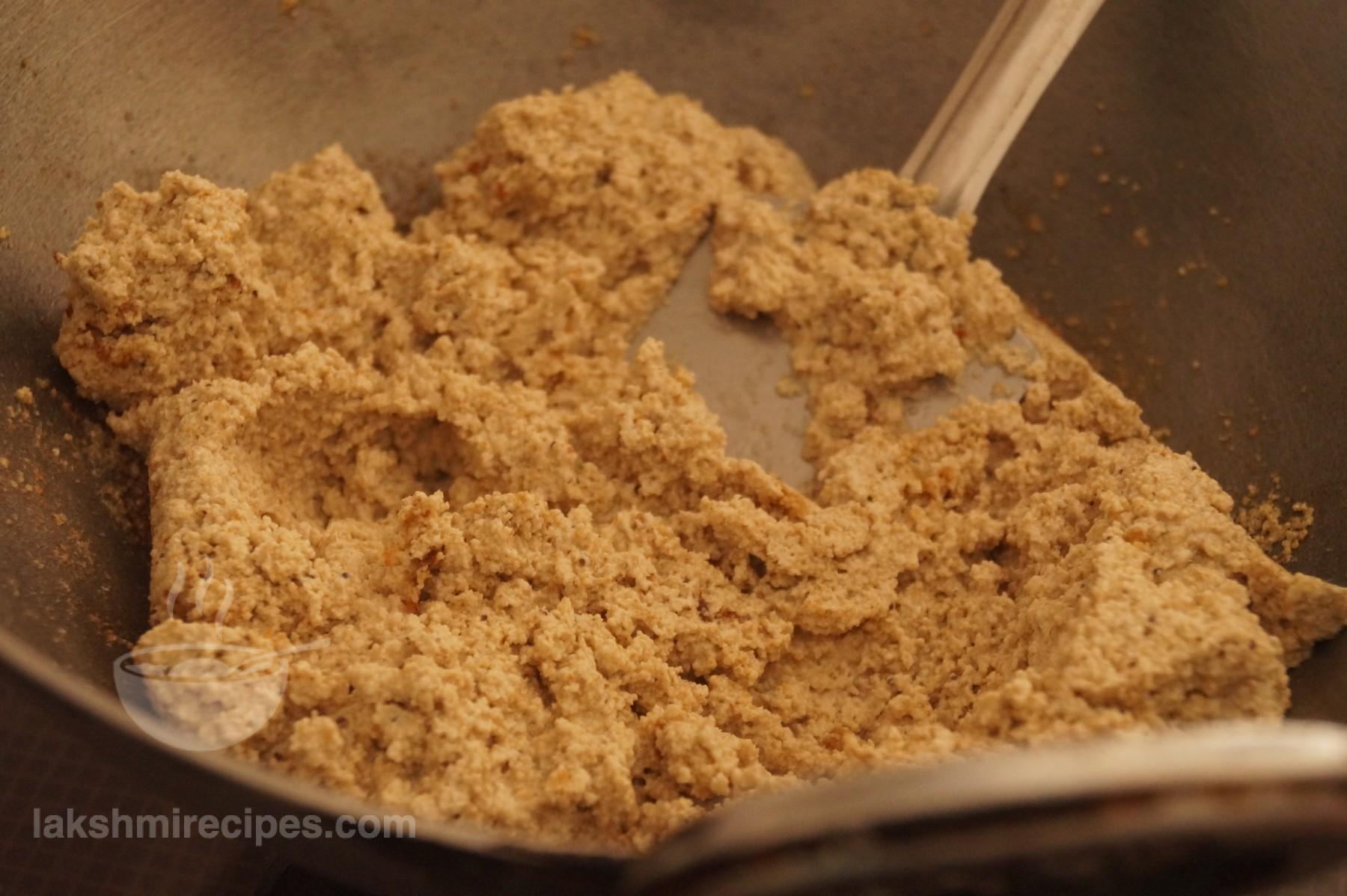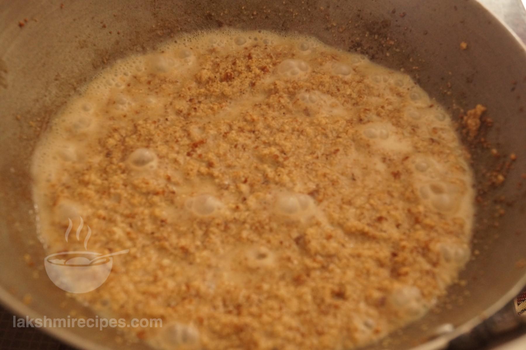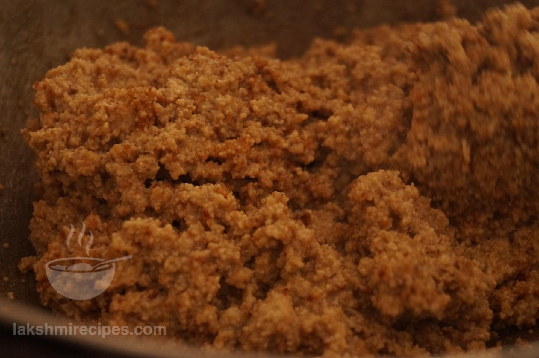 - अब एक मोटे तले की कढ़ाई में देसी घी गरम करें। कढ़ाई में खस-खस (या पोस्ता-दाना) क दरदरा पिसा हुआ पेस्ट डालें।