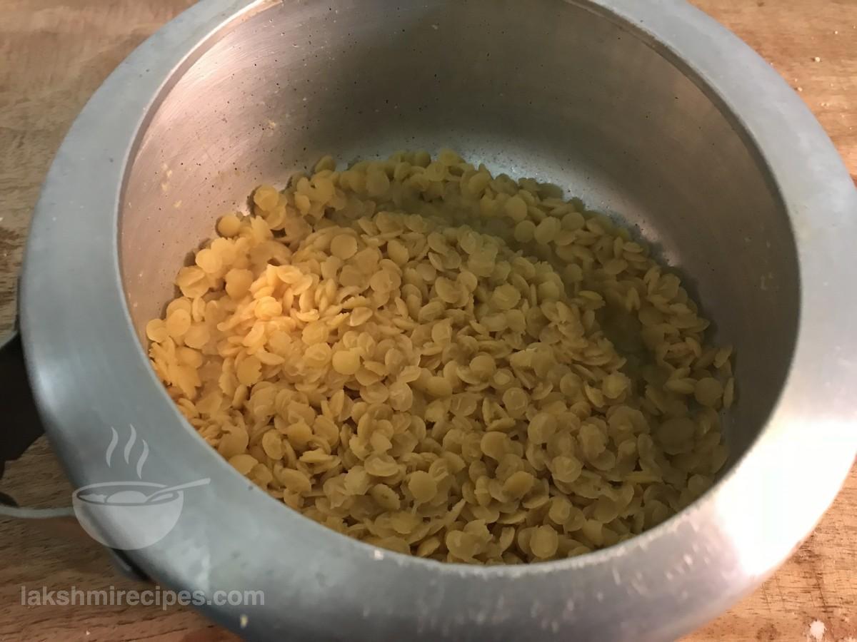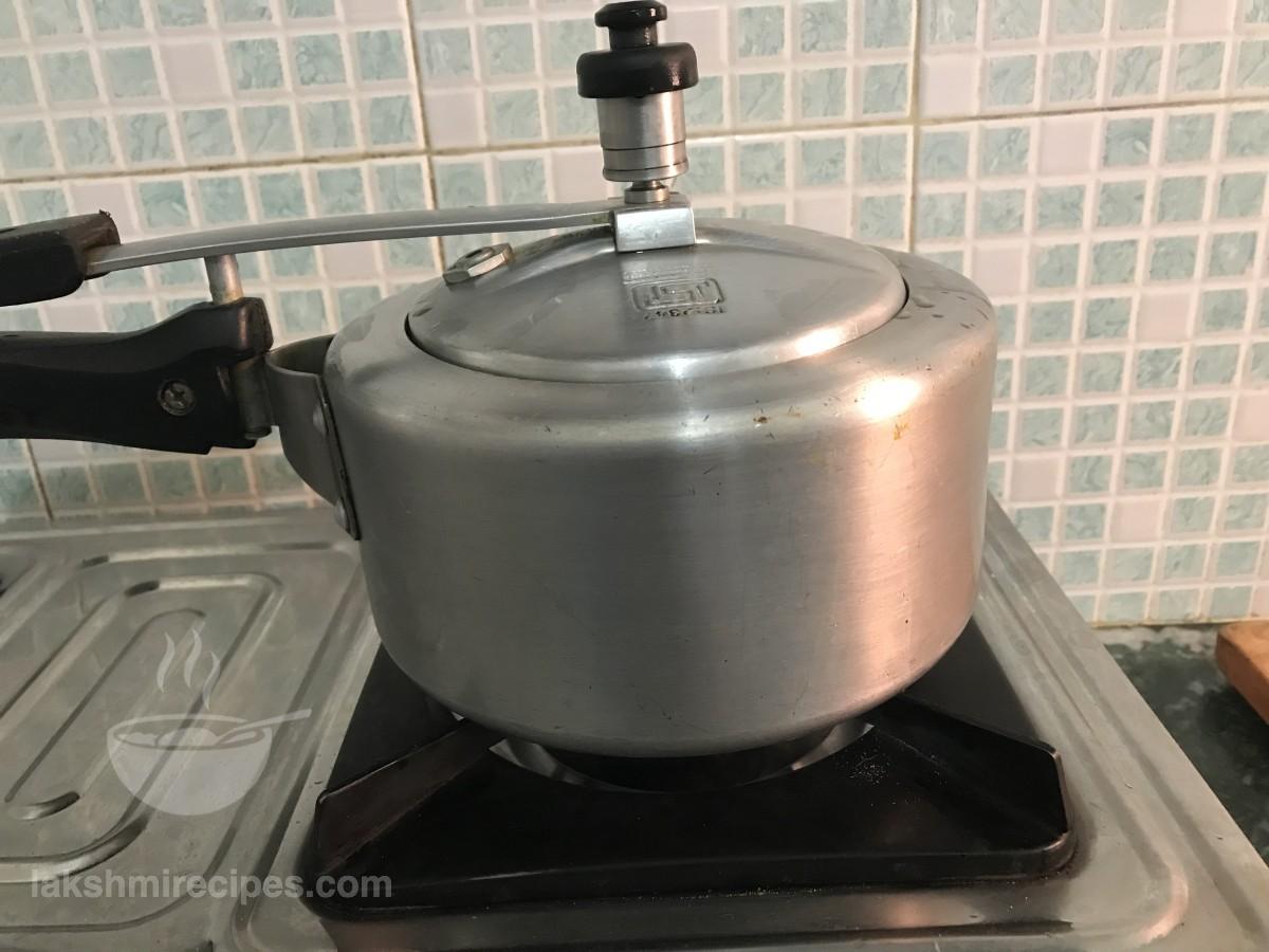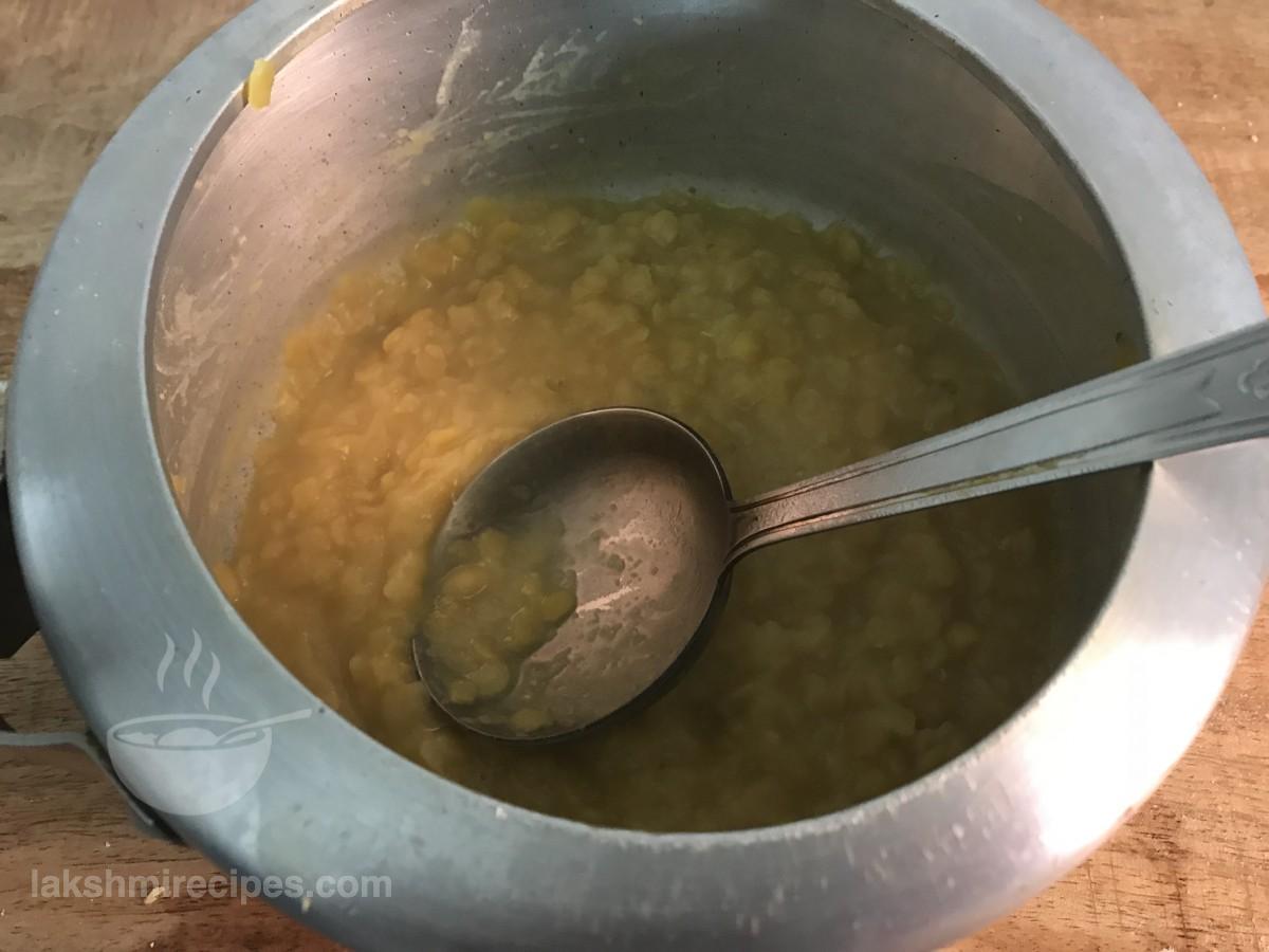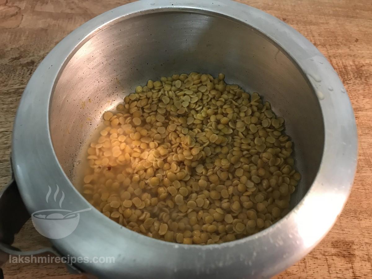 - Add 1 small cup water to it and pressure cook the soaked Split red gram or toor dal for one whistle.