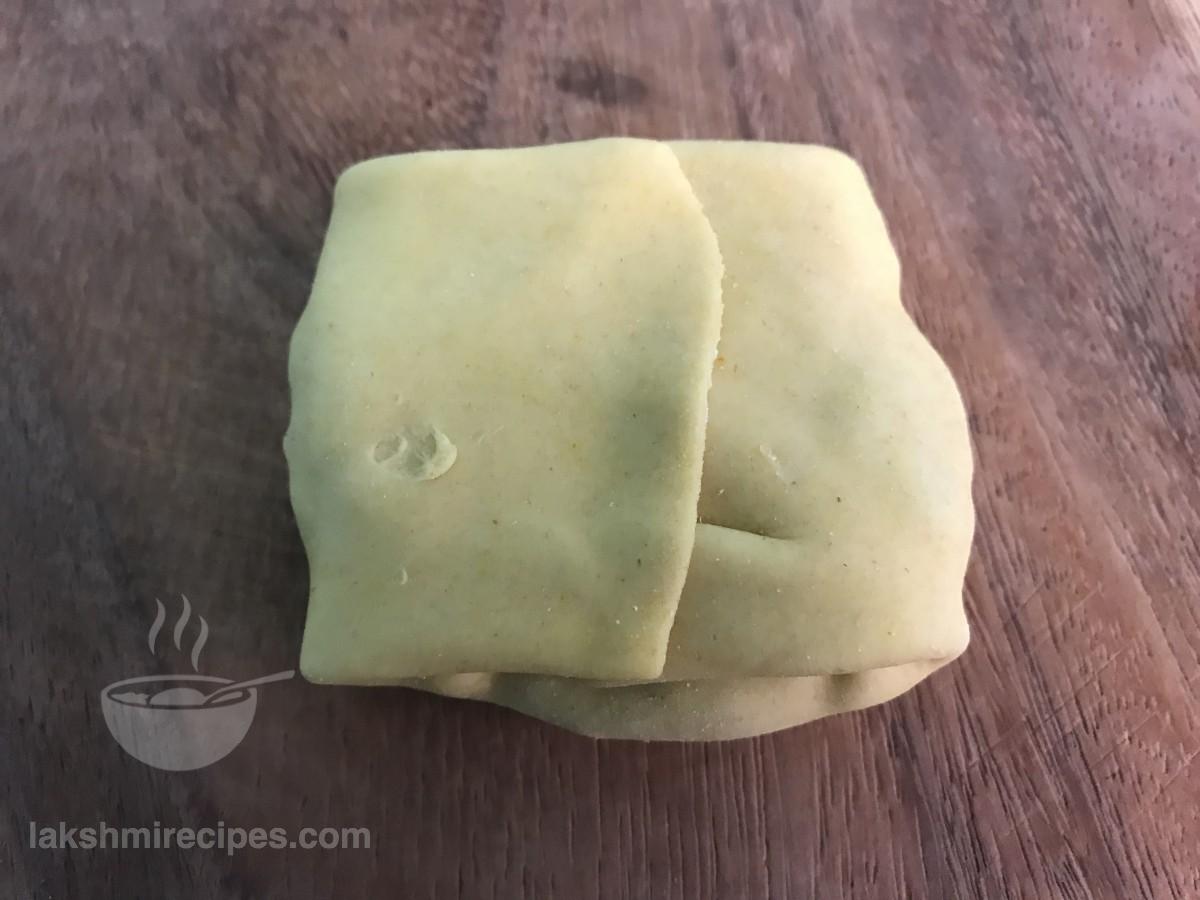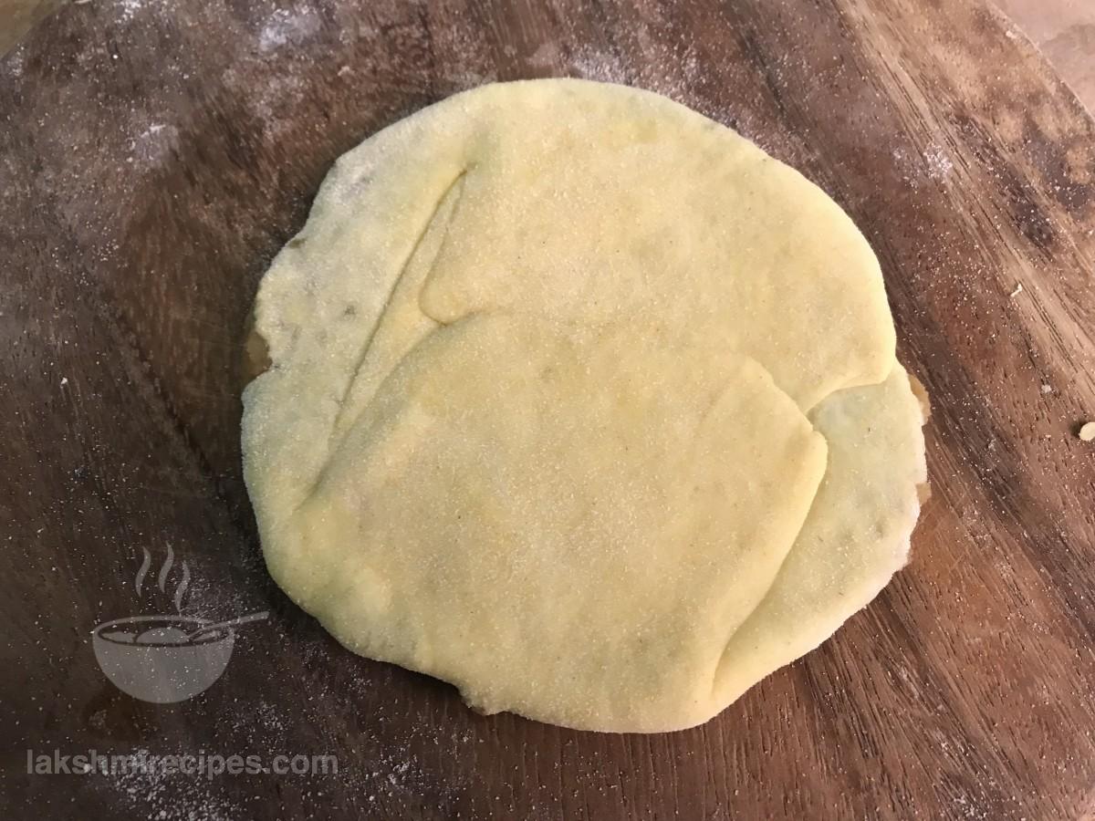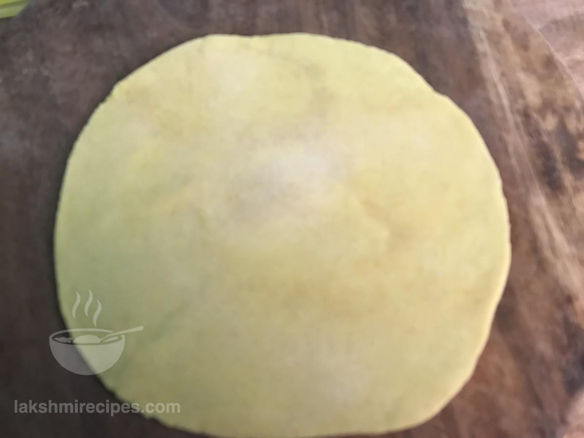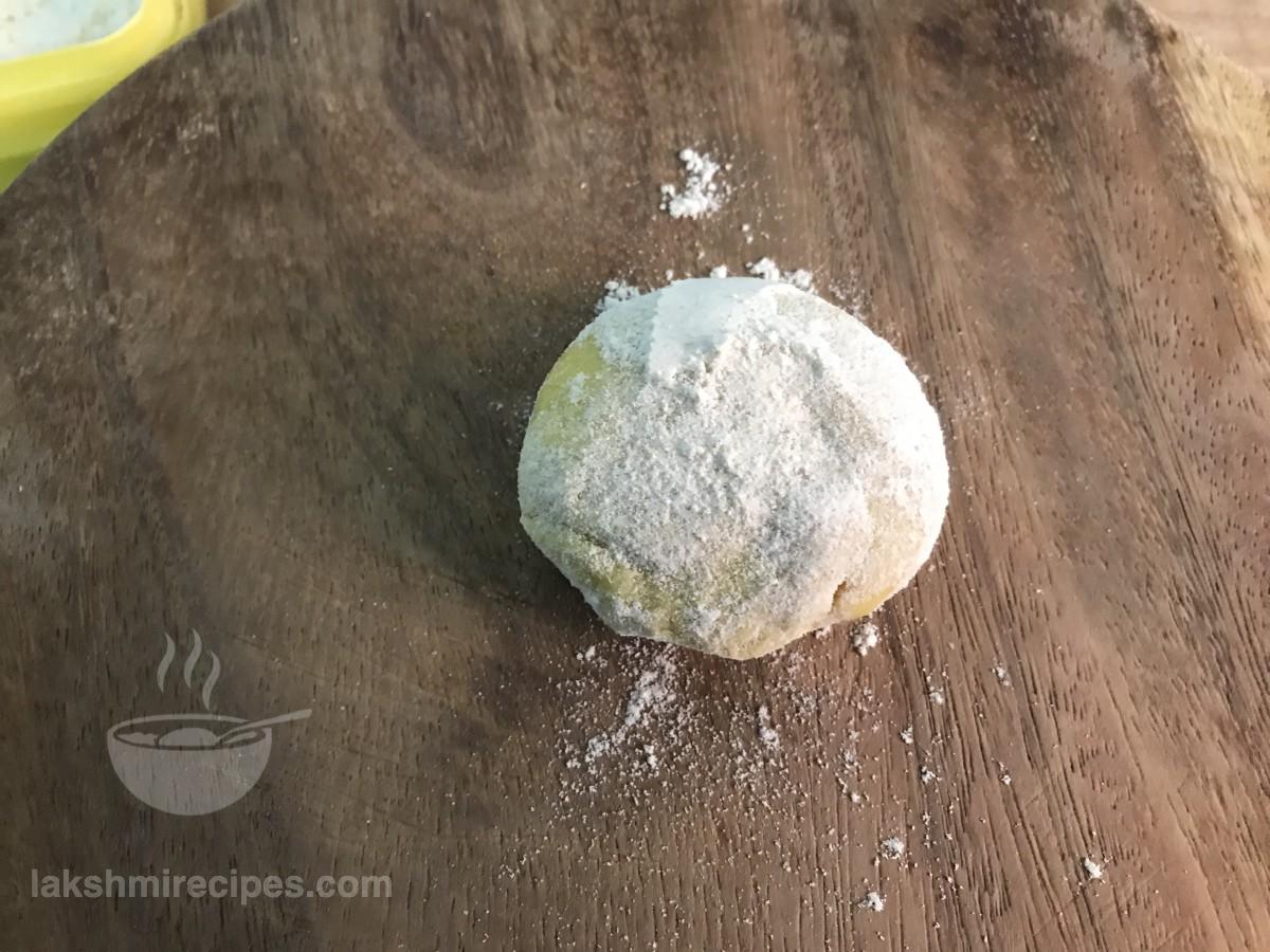 - अब गूंधा हुआ आटा लें और उसकी की छोटी-छोटी लोई लें और उन्हे हाथों से चिकना करें। फिर एक लोई लें और उसे गोल चपाती की तरह बेल लें।