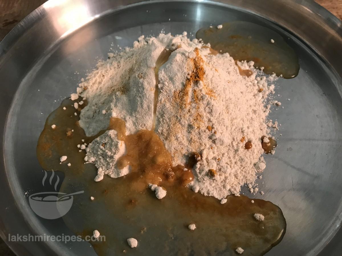 - In a plate take all purpose flour or whole wheat flour and add a pinch of salt, turmeric powder and 2 table spoon refined oil or ghee to it. Mix the ingredients well.