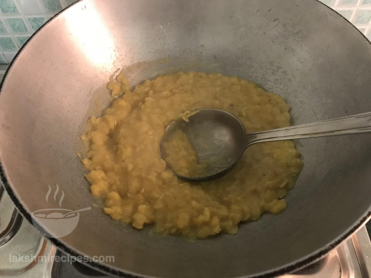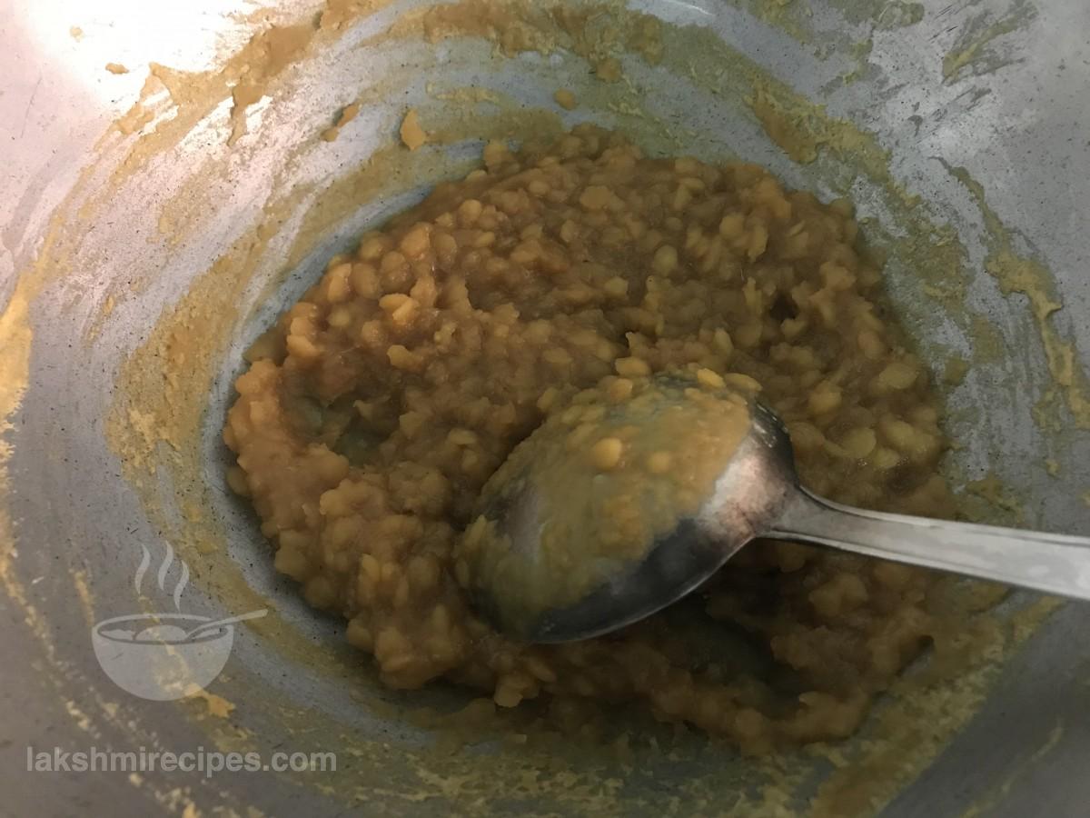 - Then open the lid of the pressure cooker and check if the Split red gram or toor dal is nicely cooked and all the water has dried up. If there still remains water in the pressure cooker then stir and cook the Split red gram or toor dal over high flame till all the water has dried up. Mash the cooked Split red gram or toor dal with a ladle until smooth.