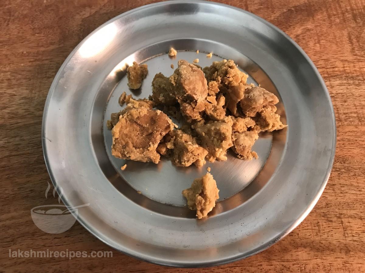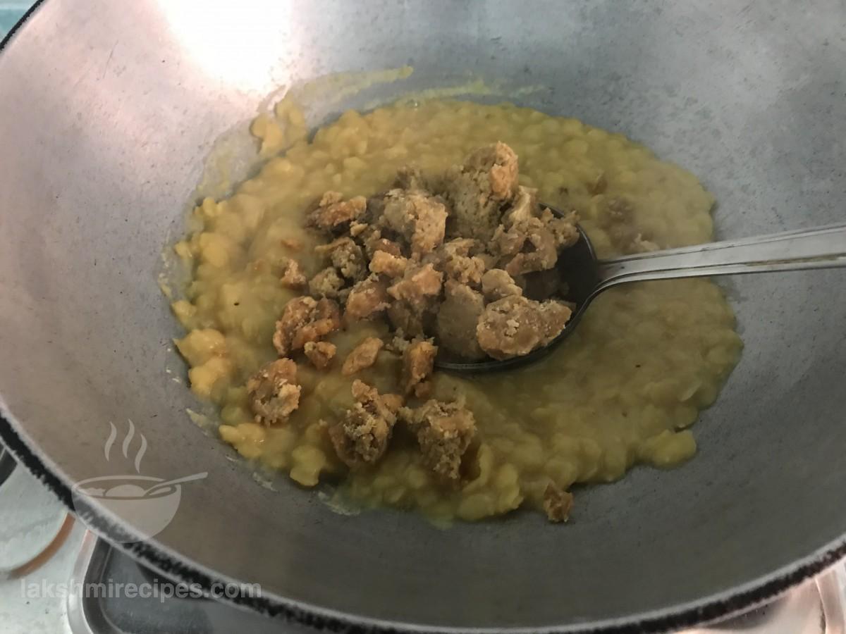 - Add crushed jaggery to it. Mix and cook the ingredients together over medium flame till a moist halwa or paste like texture is obtained. Check if jaggery has melted and mixed well with the cooked split red gram or toor dal.