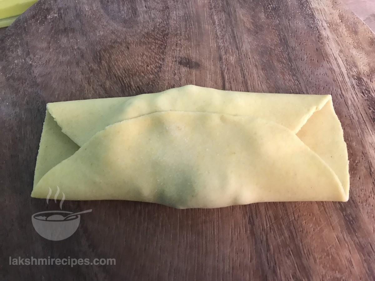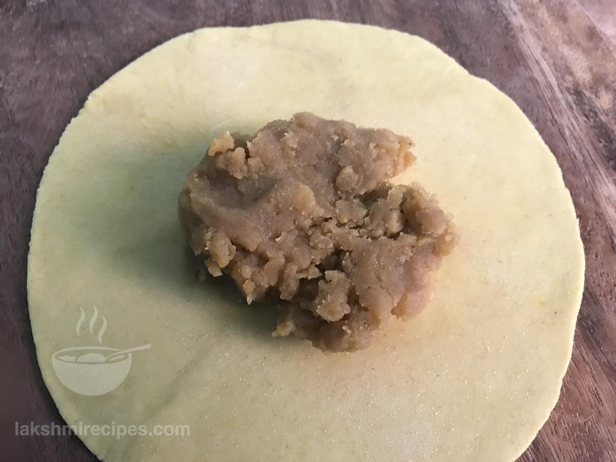 - Now using a table spoon, place enough dal stuffing at the center of this chapati, and fold the sides as shown in the images below. Give a round shape to the dumpling prepared with the help of your hand.
