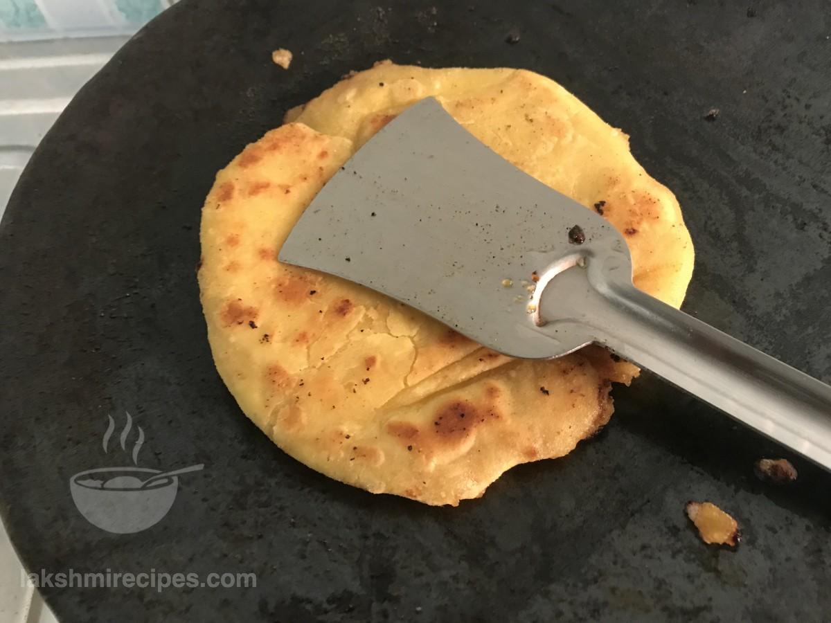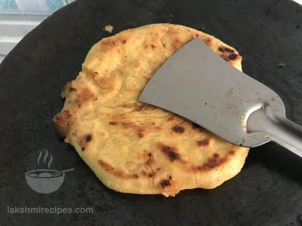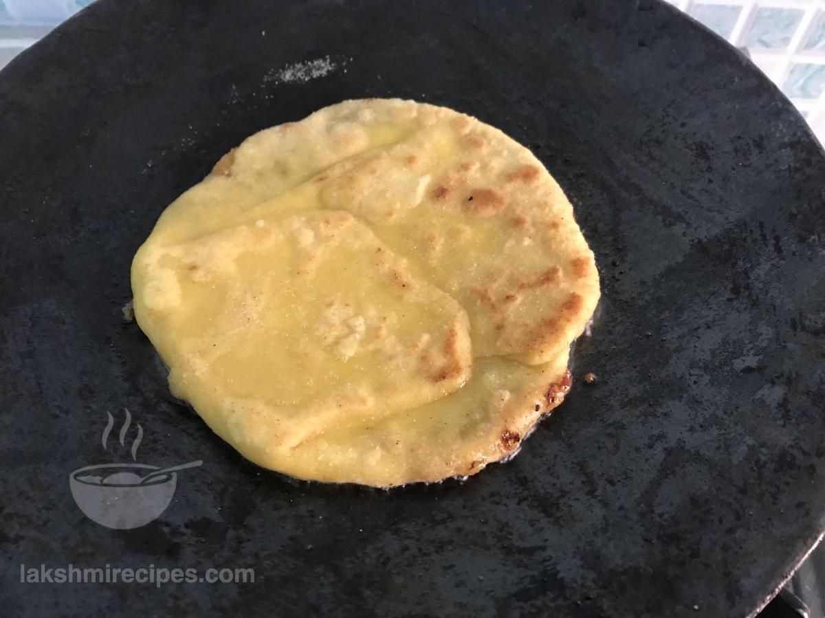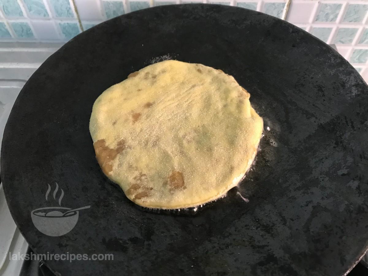 - Heat a tawa and grease it with ghee or refined oil. Lay the Puran Poli onto it and allow it to cook. Flip to other side and let it cook too. Apply ghee or oil on the top side flip and repeat the same step. Flip, press and cook both sides turn golden brown, on medium flame. Cook the Puran Poli over medium flame only so that the flour layer is nicely cooked.