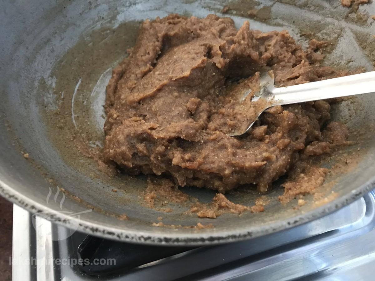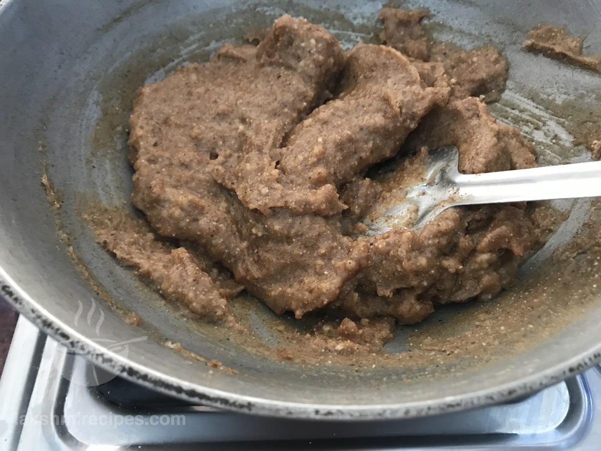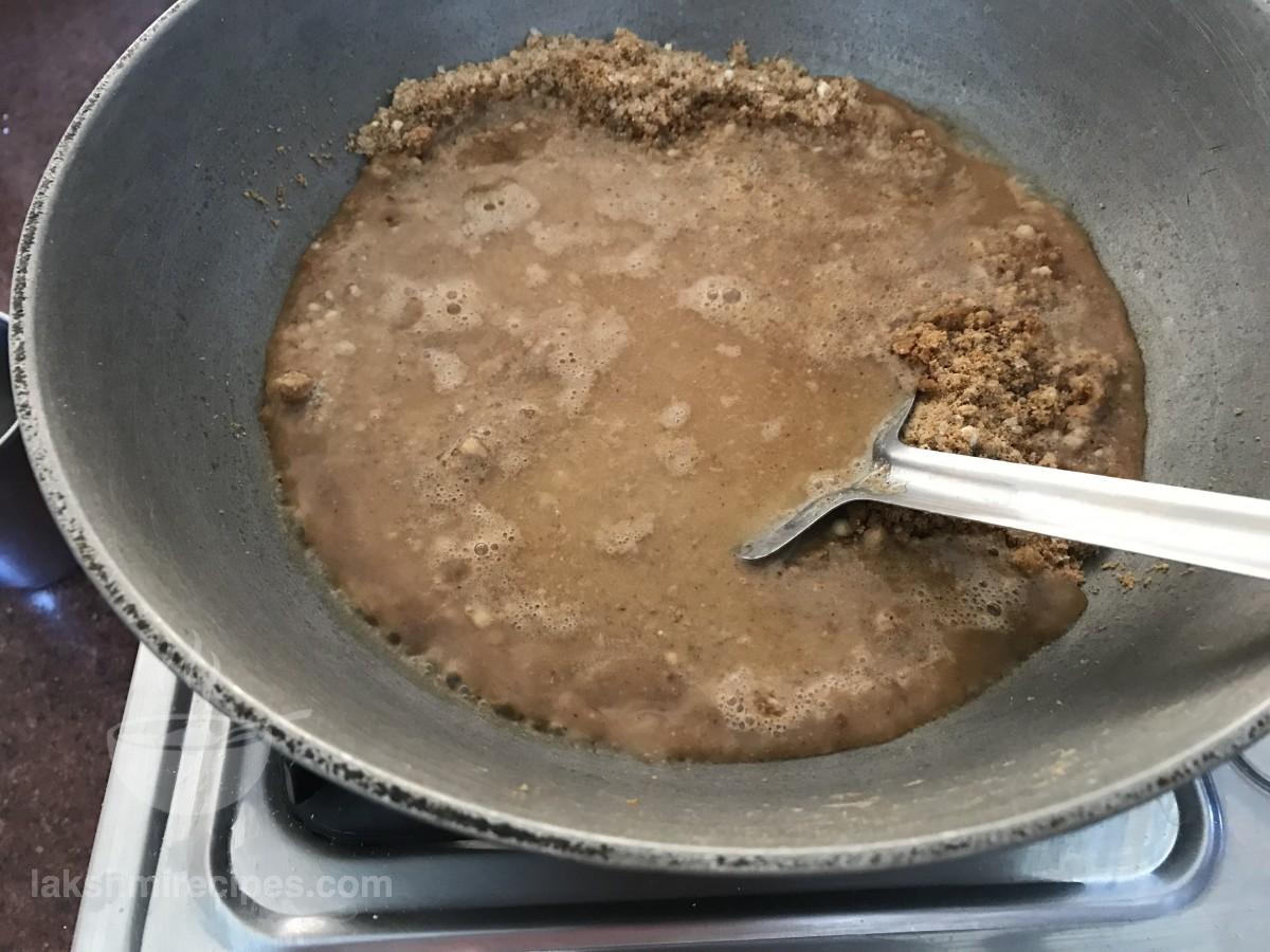 - फिर कढ़ाई में लगभग 1.5 बड़ा कप पानी डालें और सामग्रियों को एक साथ मिलाएं।याद रखे कि कोई गांठ न बनें।