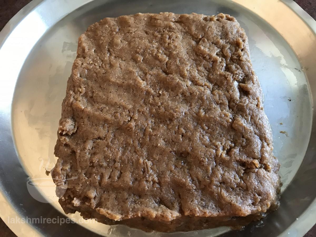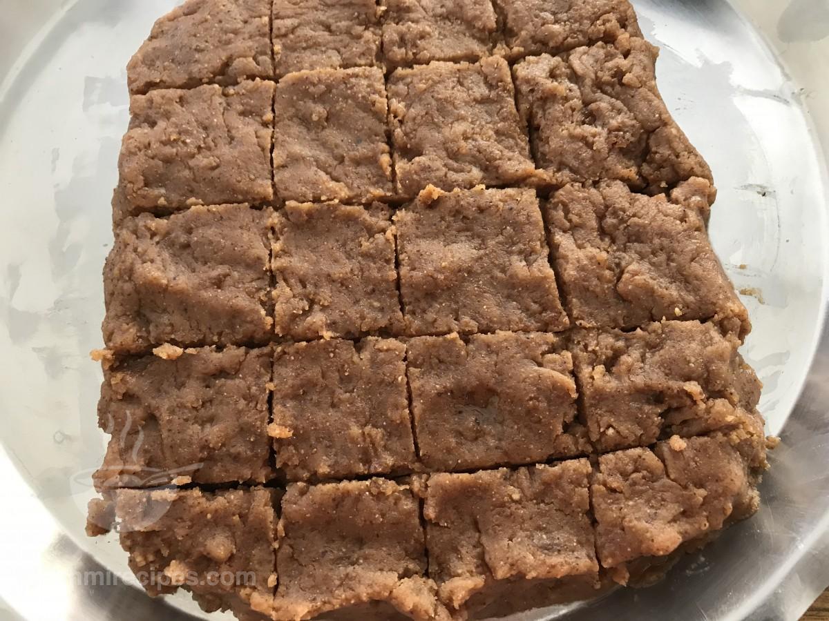 - Or grease a separate plate with ghee. Spread the Singhare Ka Halwa uniformly onto the plate and allow it to cool to room temperature. Cut small pieces of the halwa of different shapes (rectangle, triangle, square etc) and serve in a beautiful dish.