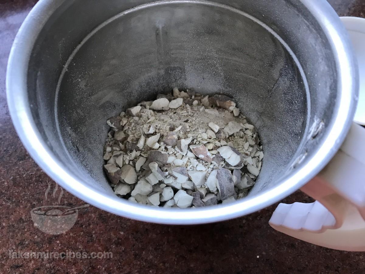 - Take dried waterchestnut or sookha hua singhara, and crush them into small pieces. Then transfer the broken pieces to a mixer jar and grind them to form a fine powder. The fresh Singhare Ka Atta or Waterchestnut Flour is ready. Alternatively you can also use the Singhare Ka Atta or Waterchestnut Flour available in packets in market.