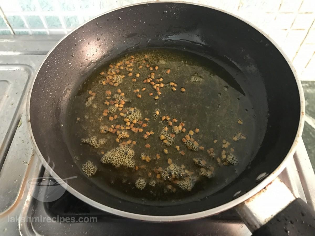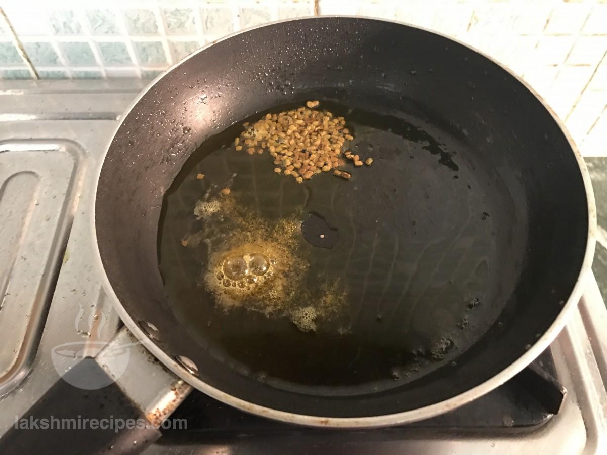 - इसी नॉन-स्टिक पैन में थोड़ा और तेल डालकर मेथी दाना और हींग डालें।