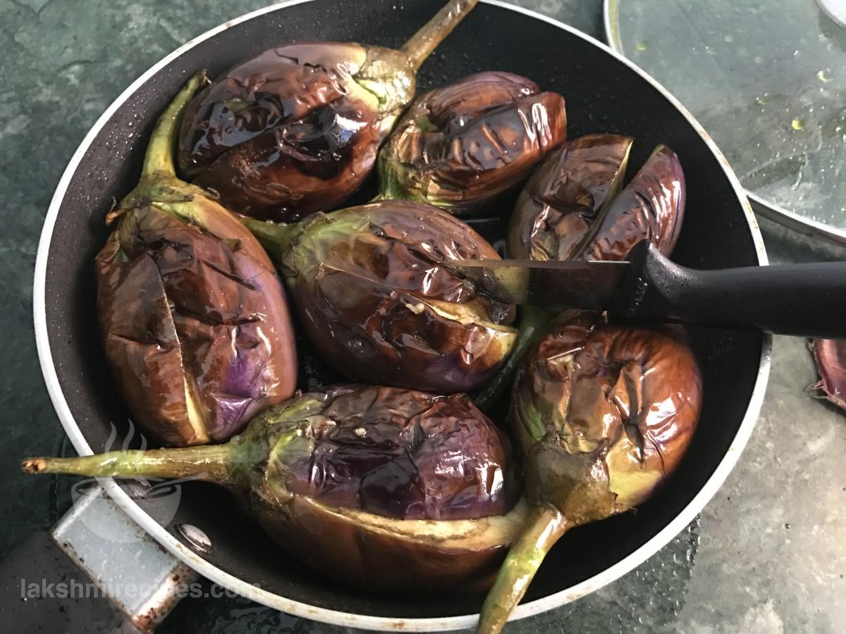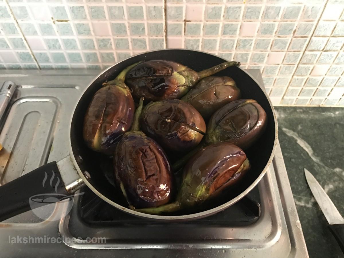 - 5 मिनट के बाद ढक्कन को हटा दें और बैंगन को उलट-पलट कर सभी तरफ से अच्छे से पकाएं। बैंगन कम तेल में आसानी से पक जाते हैं। बैंगन में चाकू डालकर देखें की वे बीच में पक गये हैं या नहीं। फिर इन पकाये हुए बैंगन को एक प्लेट में बाद में इस्तेमाल करने के लिए निकल लें।