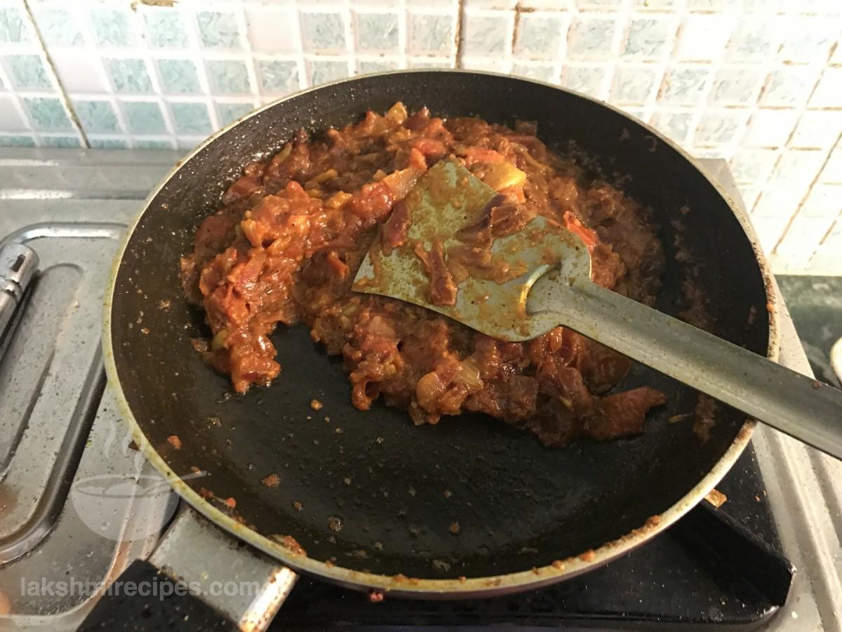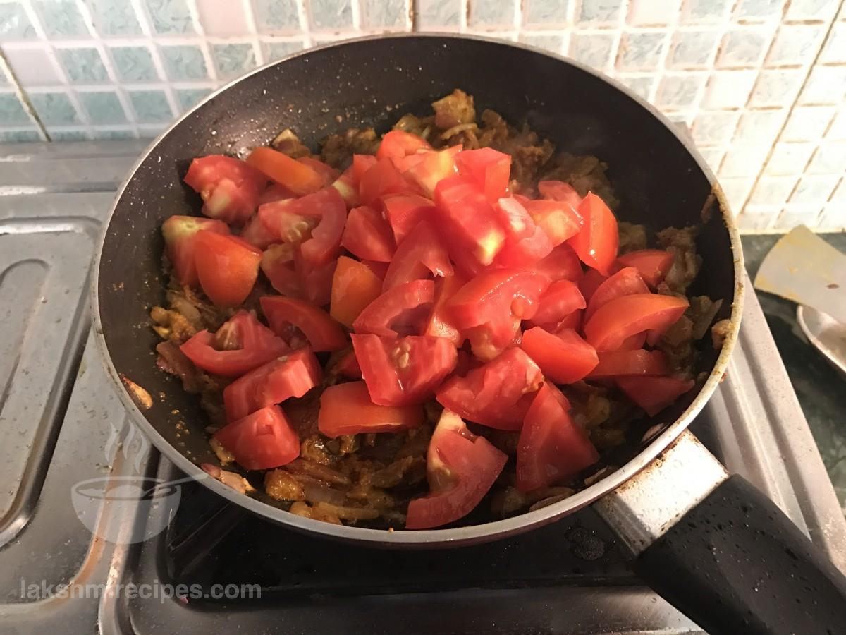 - Now add the finely chopped tomato to the non-stick pan. Stir and cook the tomato pieces with the cooking ingredients. Cook till the tomato pieces become soft and attain a paste like texture by mixing with the other ingredients.