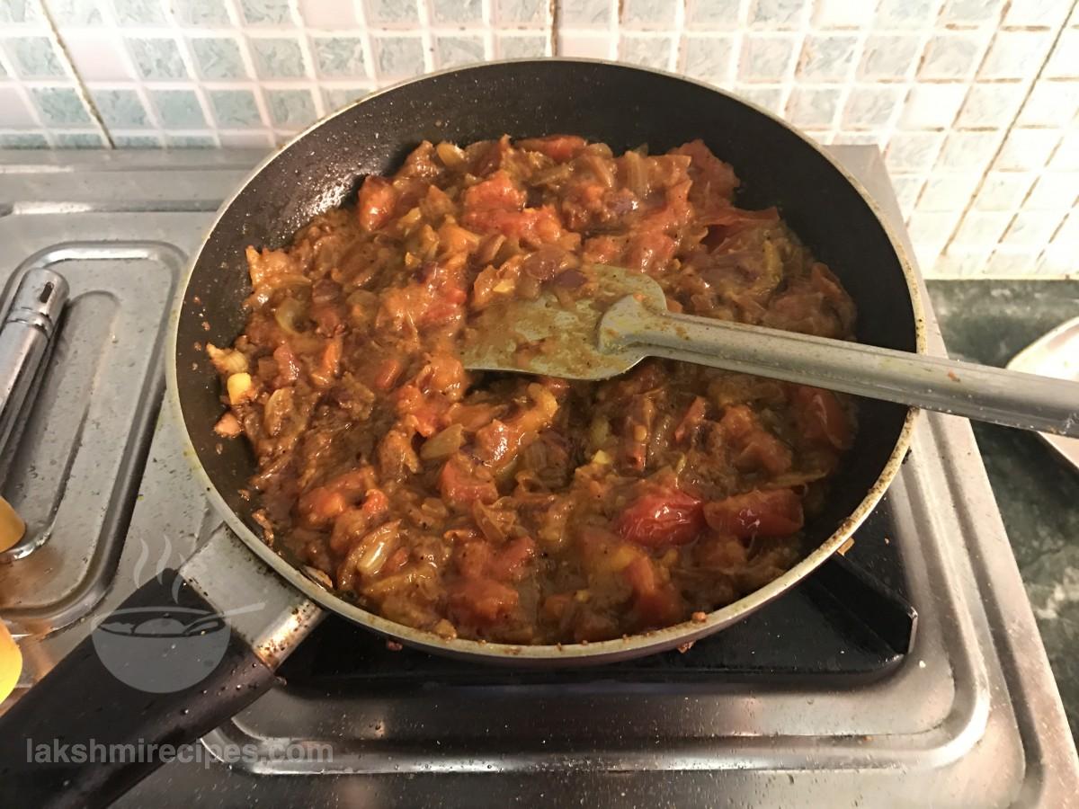 - फिर ग्रेवी मसाला मिश्रण में पके हुए बैंगन डालें और आँच को कम कर दें। बैंगन को ग्रेवी मसाला मिश्रण में 10 मिनट के लिए पकने दें। 10 मिनट में ग्रेवी अच्छे से पककर गाढी हो जाएगी और बैंगन भी ग्रेवी के साथ अच्छे से पक जाएंगे।