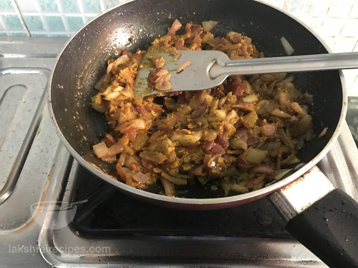 - Then add the cooked brinjals to the non-stick pan and lower the flame to low level. Allow the brinjals to cook in the gravy masala mixture for 10 minutes. During this time the water will evaporate from the gravy masala mixture forming a thick gravy and brinjals will get cooked nicely with the gravy masala mixture.