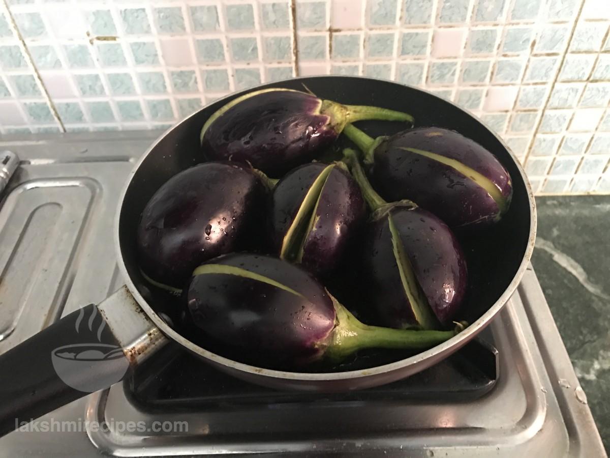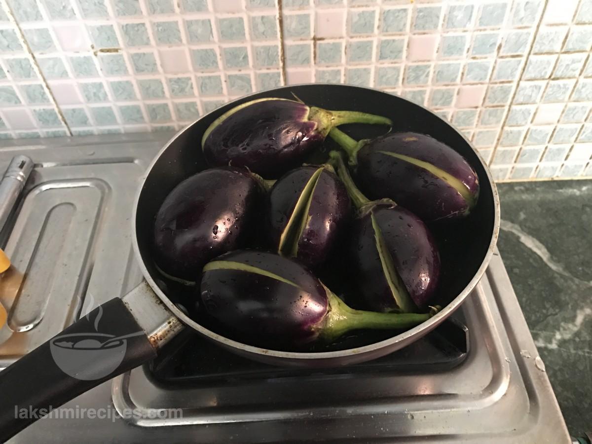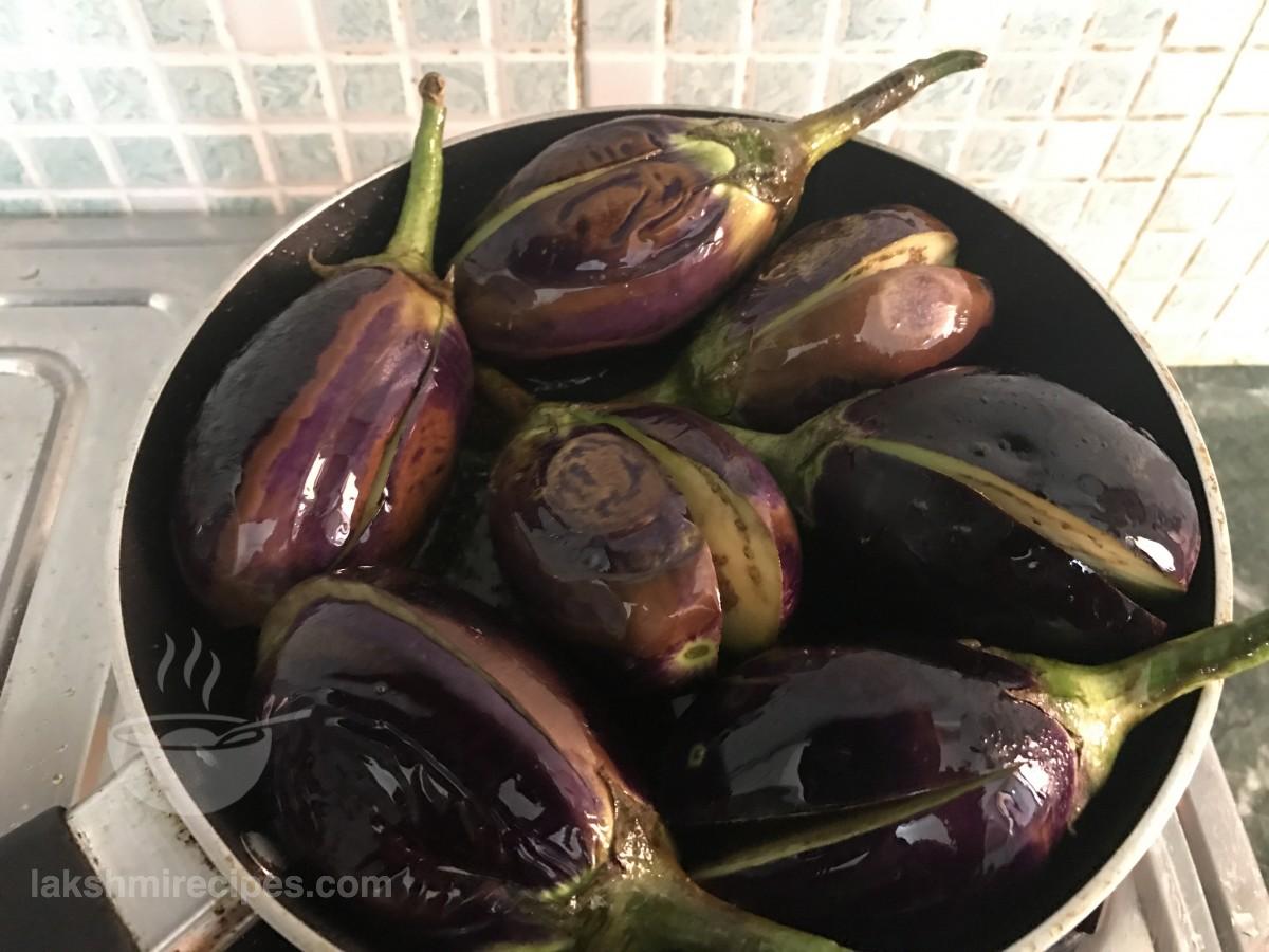 - After 5 minutes remove the lid and flip the brinjals. Flip and cook the brinjals nicely on all sides. Brinjals get cooked easily. To check, poke the brinjals with a knife to see if they are cooked at the center or not. Then remove these cooked brijnjals to a plate to be used later.