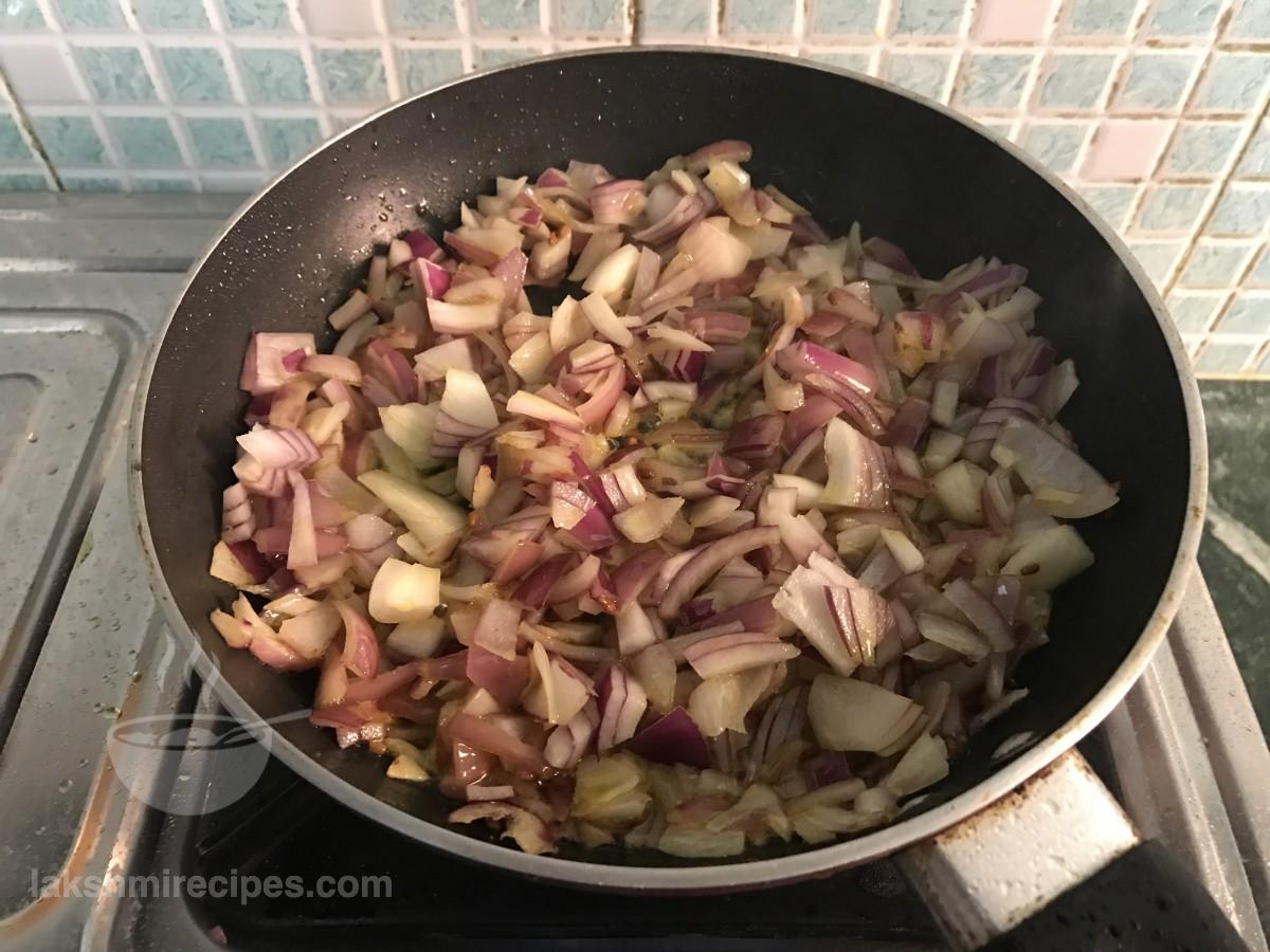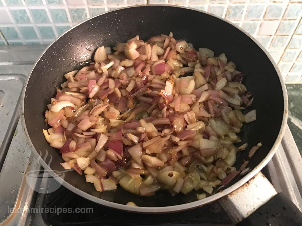 - Allow the fenugreek seeds to crackle and then add finely chopped onion to it. Saute the onion pieces till they turn golden red in color.