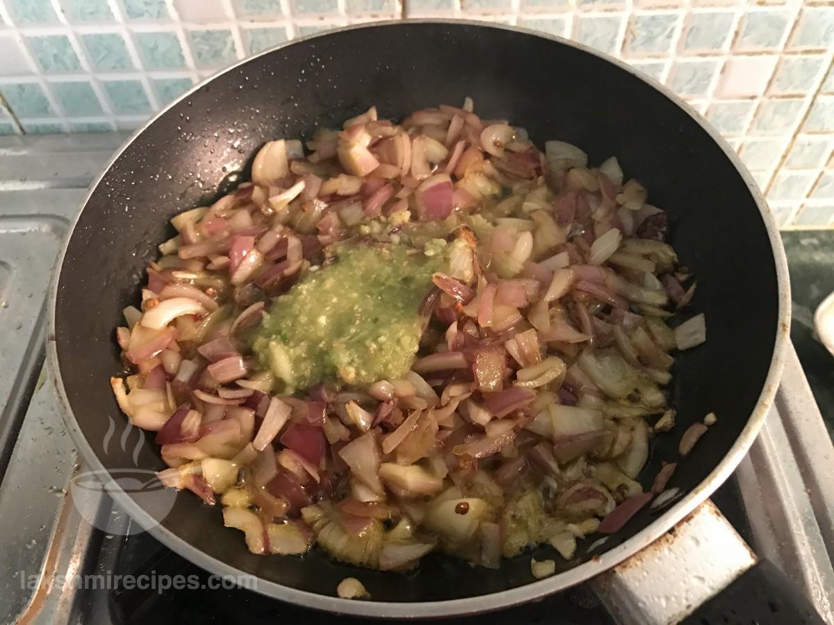 - Now add the paste of ginger-garlic-green chilli to the non-stick pan. Stir and saute the ingredients together.