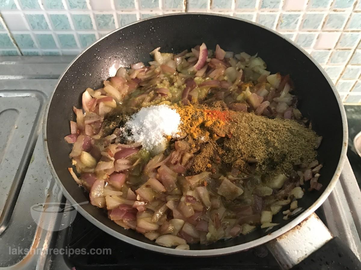 - Then add the powdered spices (turmeric powder, cumin seeds powder, red chilli powder, black pepper powder, coriander powder) and salt to the cooking ingredients. Mix and cook the spices for few seconds.
