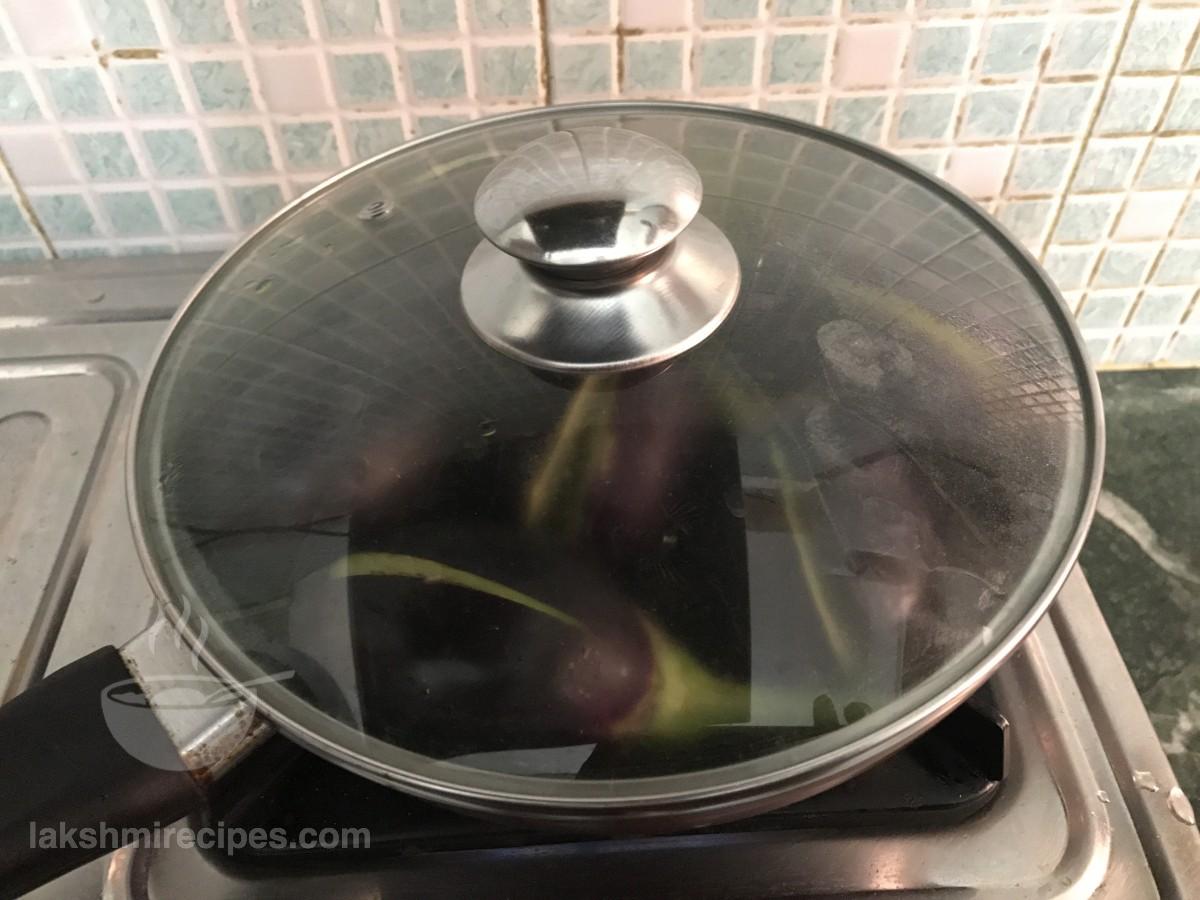 - Cover the non-stick pan with a lid and lower the flame to low level. Allow the brinjalsto cook in this manner for 5 minutes.