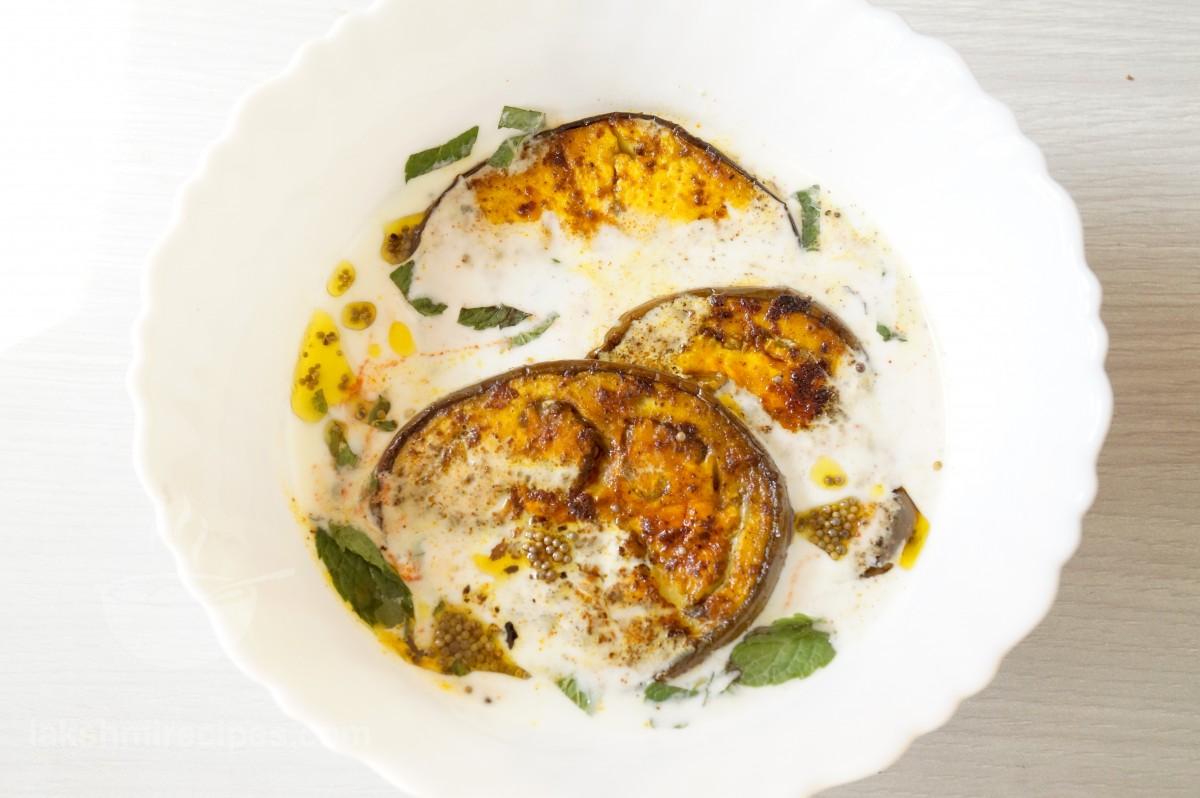 - Then pour this tadka over the dahi baingan spreading it evenly. The tempting dahi baingan is ready to be served.