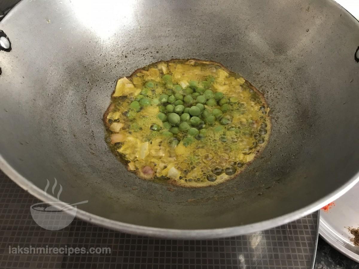 - फिर हरी मटर डालें और इसे बाकि सामग्री के साथ हल्का सा भून लें।