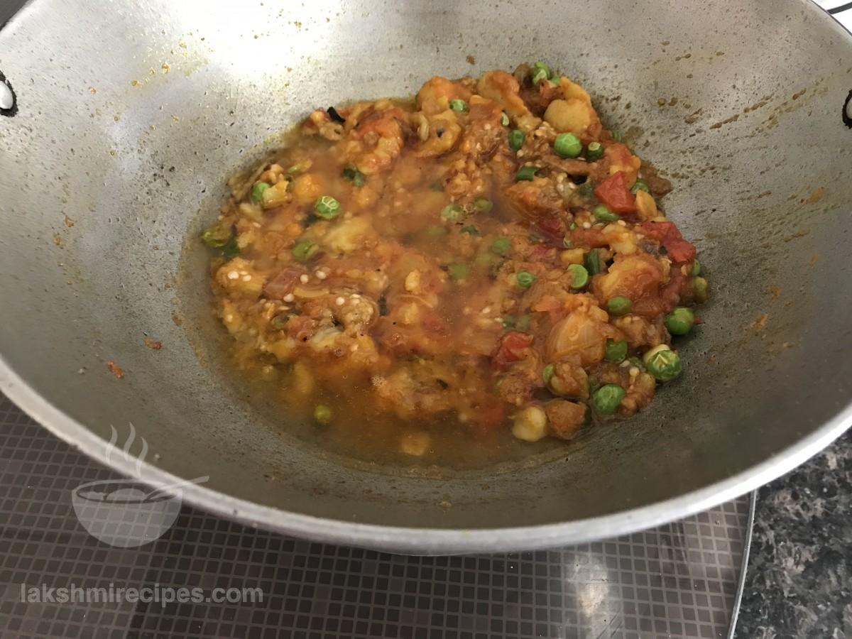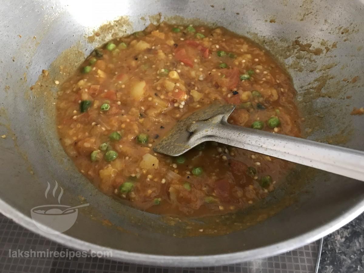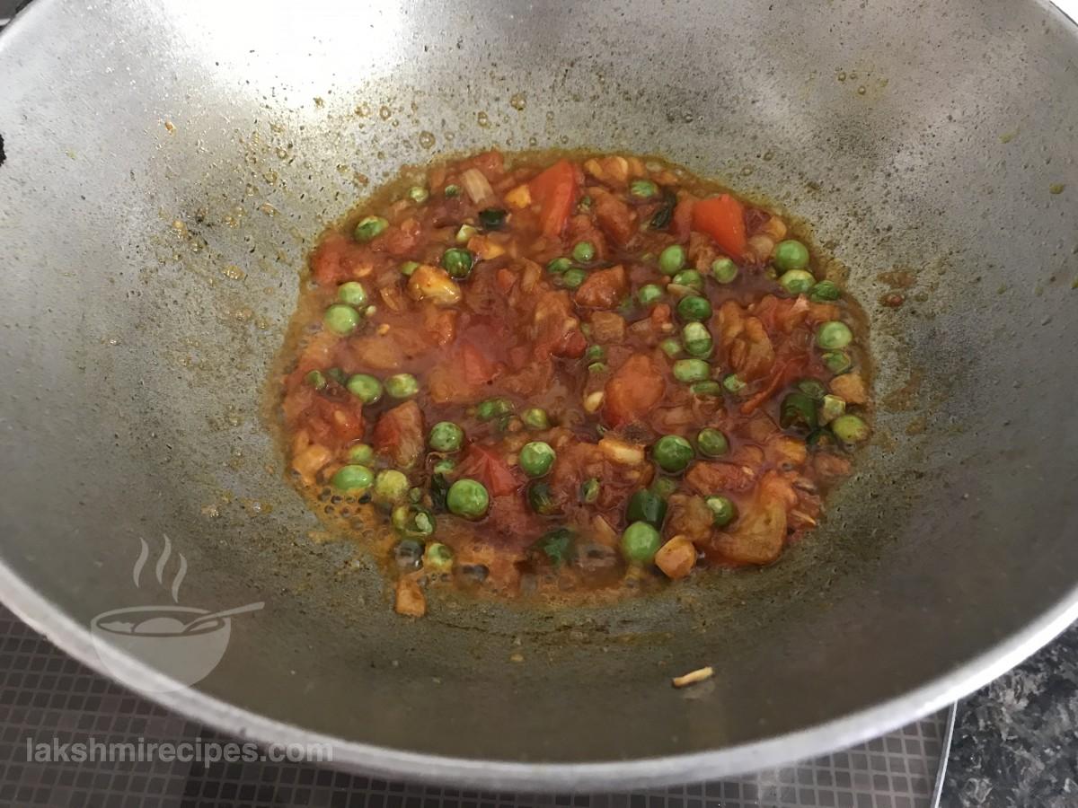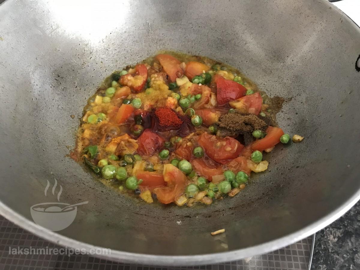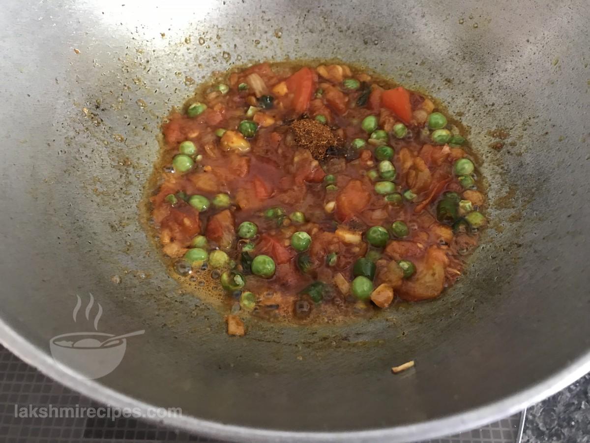 - Add garam masala powder, mix and cook for some time. Press and mash the ingredients with the back side of the ladle. Check a few pea grains if they are cooked and have become soft.