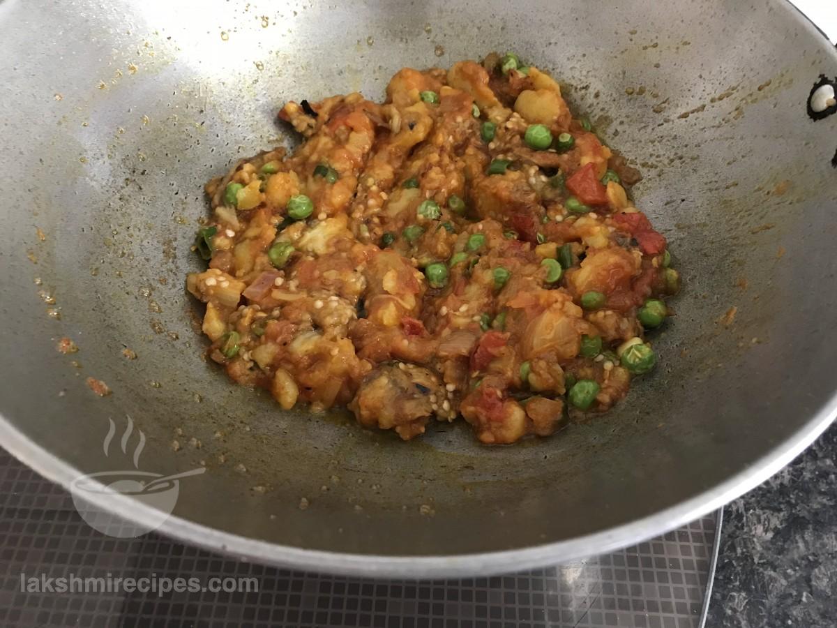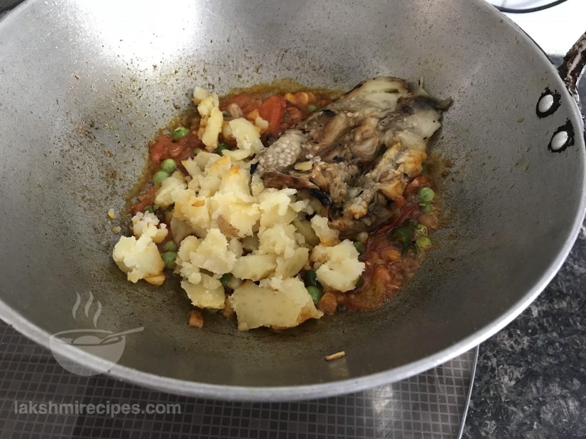- Now add mashed boiled potato and mashed roasted brinjal to the kadhai. Mix the ingredients in the ladhai well.
