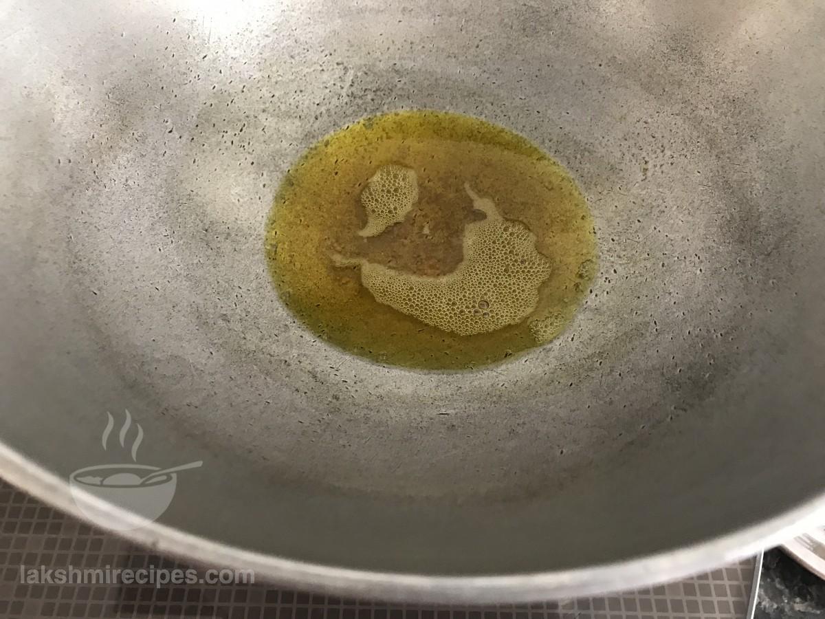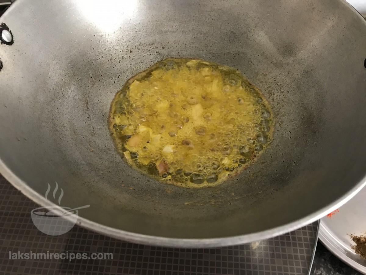 - Now heat some oil in a kadhai and add finely chopped onion, green chilli and garlic to it. Saute the ingredients till they become golden brown in color.