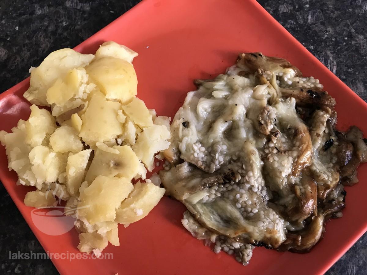 - When the brinjal is nicely roasted then turn off the flame and remove it to a plate. Allow the brinjal to cool and then remove the peel and mash them.