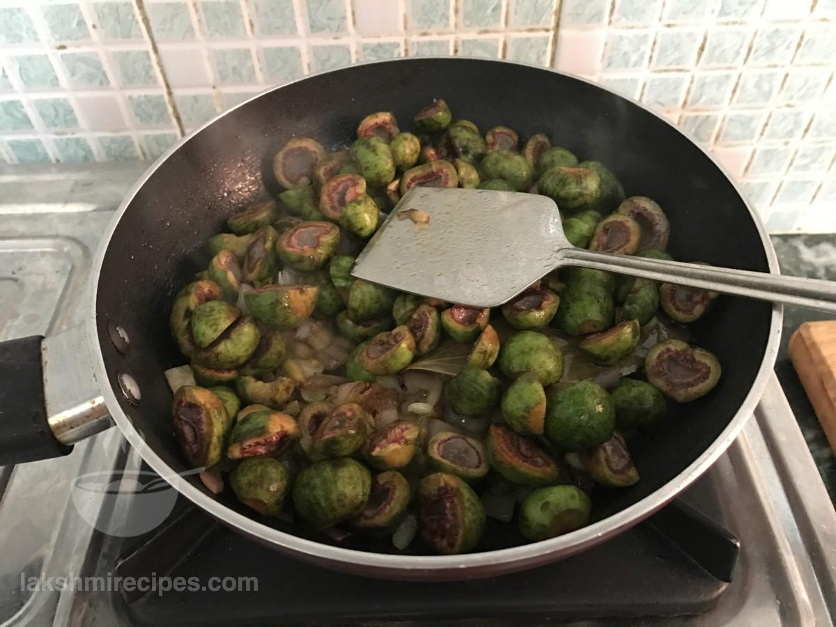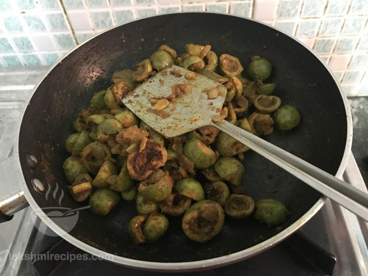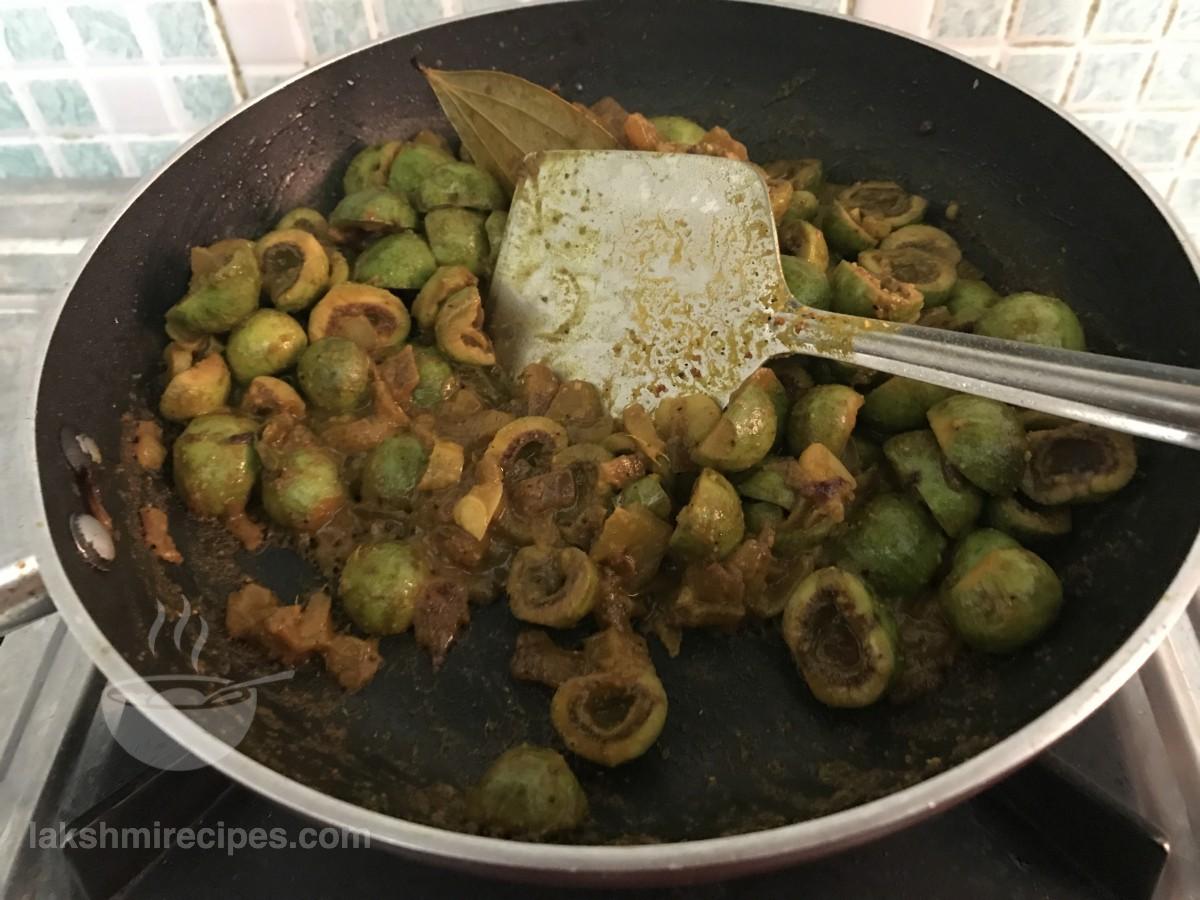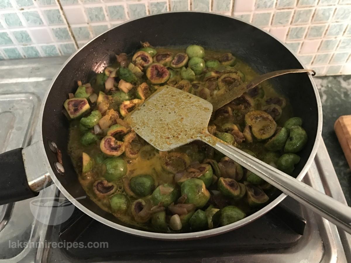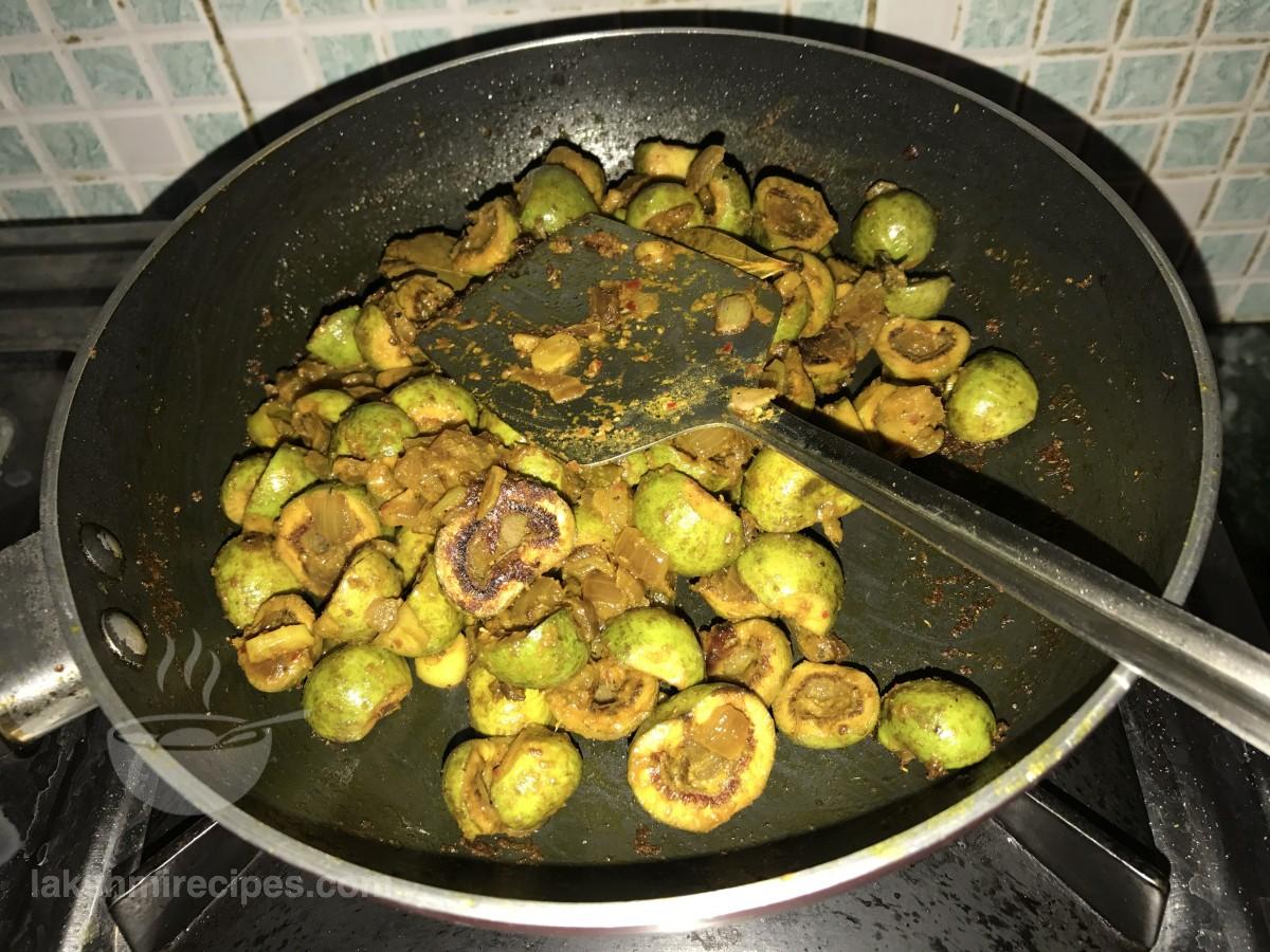 - अब कढ़ाई में मसालों के घोल को डालें और आँच को बढ़ाएं। अंजीर (या गूलर) को मसालों के साथ मिलाकर अच्छी तरह से भूनें।
