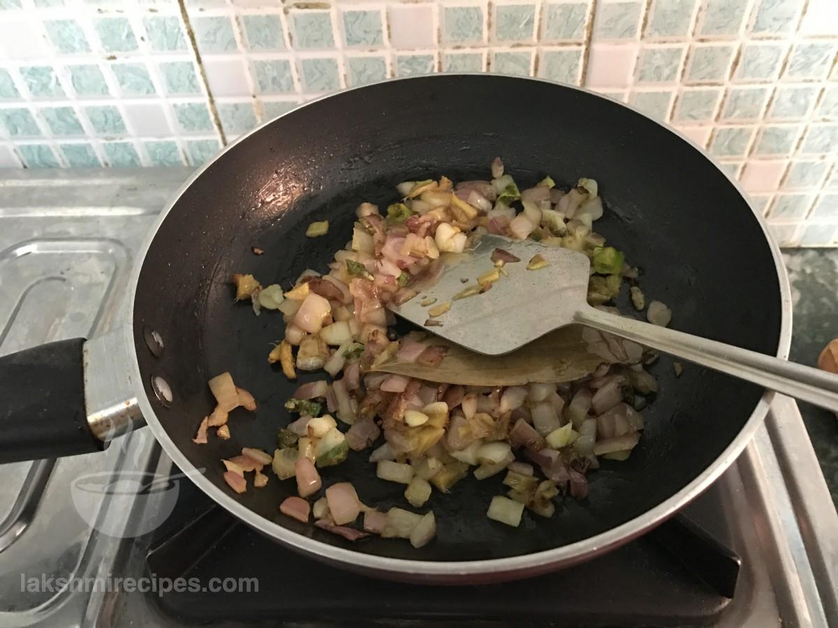 - अब इसमें बारीक कटा हुआ प्याज, अदरक और लहसुन डालें और सुनहरा लाल रंग का होनें तक सामग्री को भूनें।