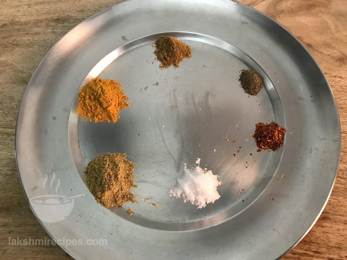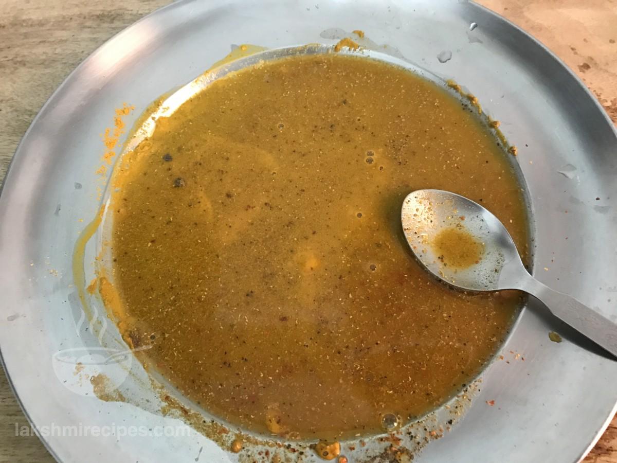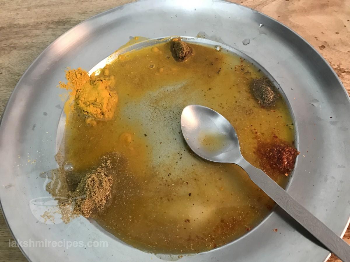 - Take all the powdered spices (turmeric powder, red chilli powder, coriander powder, cumin seeds powder and black pepper powder) and salt in a plate. Add 2-3 table spoon water to it and mix the ingredients together to form a smooth solution of spices.