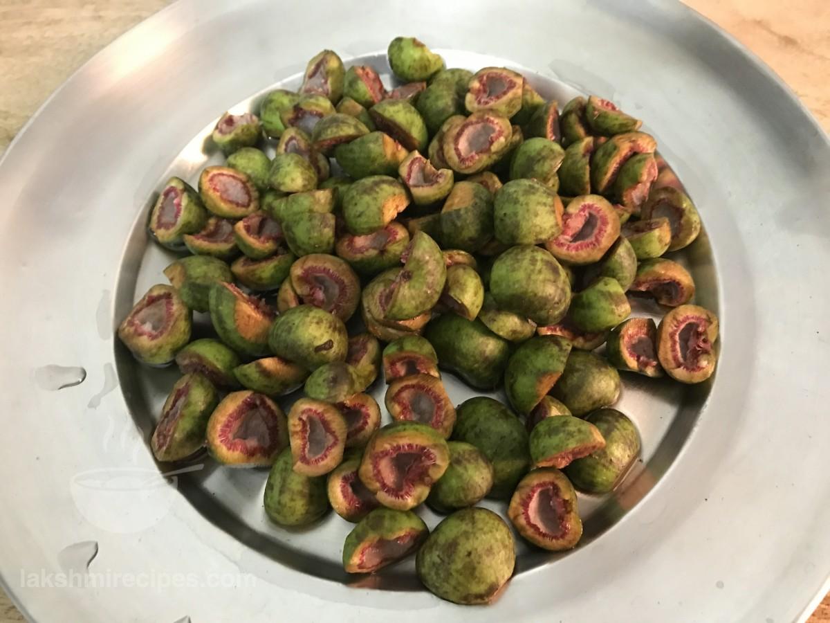 - अंजीरों (या गूलर) के ऊपर और निचले छोर को काट कर हटा दें और फिर उन सबको 2 हिस्सों में काट लें। अब उनके अंदर की सारी गंदगी और फाइबर को चाकू से खुर्च कर निकाल लें।