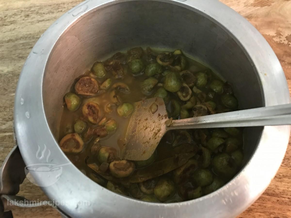 - जब मसाले अच्छे से भुन जाए तो कढ़ाई की सभी सामग्री को प्रेशर कुकर में डालें और ग्रेवी के लिए इसमें 1 छोटा कप पानी जोड़ें। प्रेशर कुकर को अपने ढक्कन के साथ कवर करें और तेज आँच पर एक सीटी आने तक सामग्री को पकाएं और फिर 2-3 मिनट के लिए इस तरह से पकाने के लिए आँच को कम करके पकाएं। फिर गैस को बंद कर दें और आपकी स्वादिश्ट और स्वास्थ से भरपूर फ़िग्स करी या गुलर की सबजी या अंजीर की सबजी परोसने के लिए तैयार हैं।