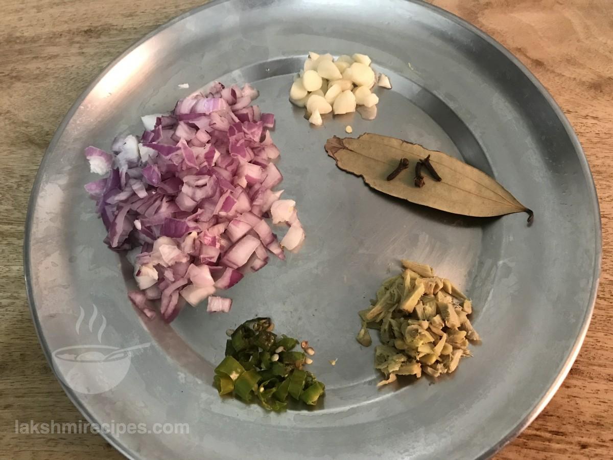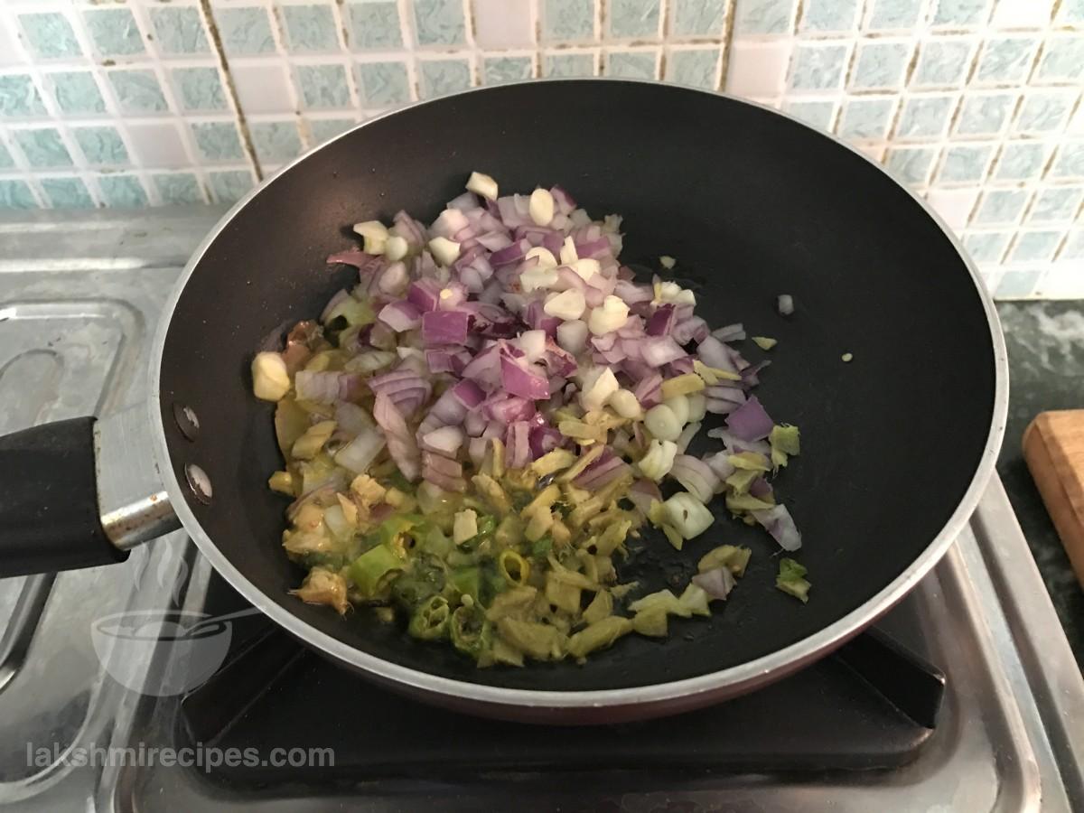 - Now add finely chopped onion, ginger and garlic petals to it and saute the ingredients till they turn golden red in color.