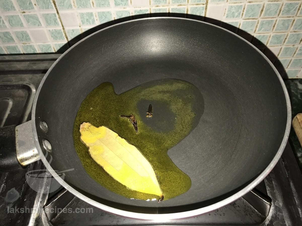 - अब एक कढ़ाई लें और उसमें सरसों का तेल डालकर गरम करें। जब तेल खाना पकाने लायक गरम होजाए तो उसमें तेज पत्ता और लौंग को जोड़ें। कुछ सेकंड तक दोनों सामग्री को चलाकर भूनें।