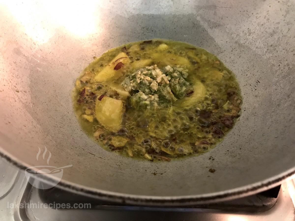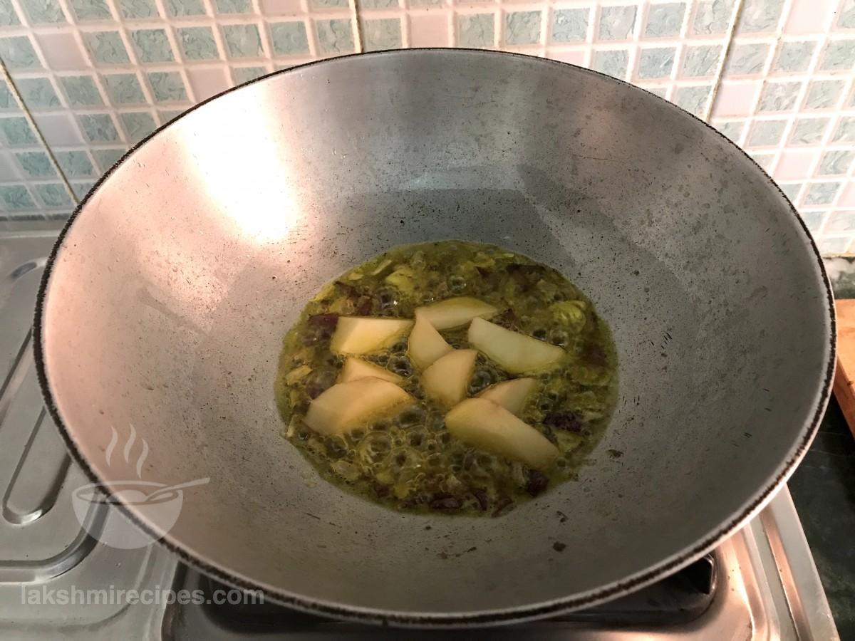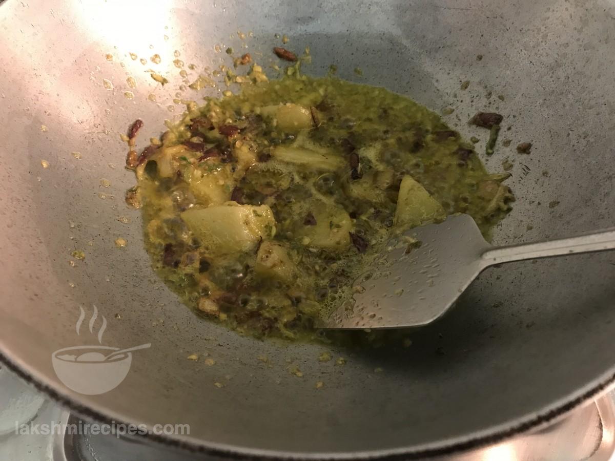 - Then add potato pieces and ground paste of ginger-garlic-green chilli to the kadhai. Saute the ingredients together.