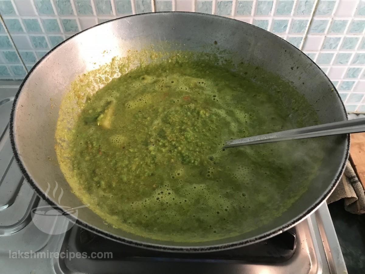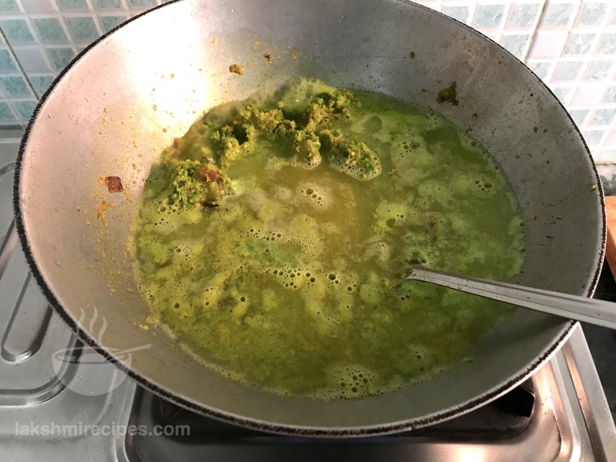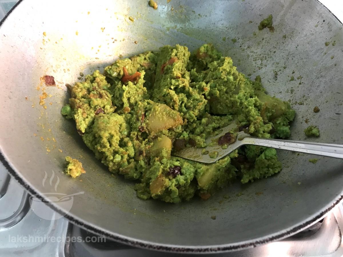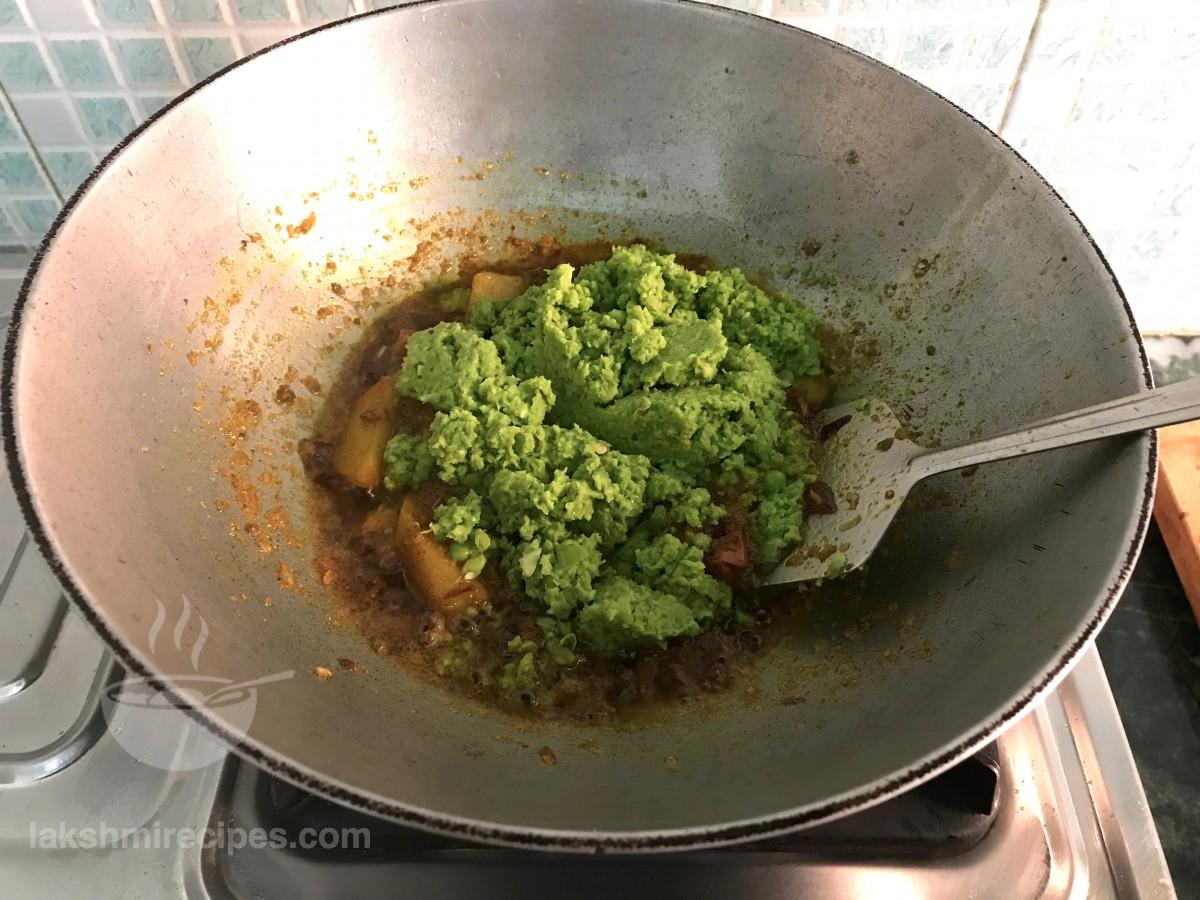 - After 1 minute add ground green peas and the remaining whole green peas to the kadhai. Stir and mix the ingredients. Saute the green peas with the other ingredients for 1 minute.