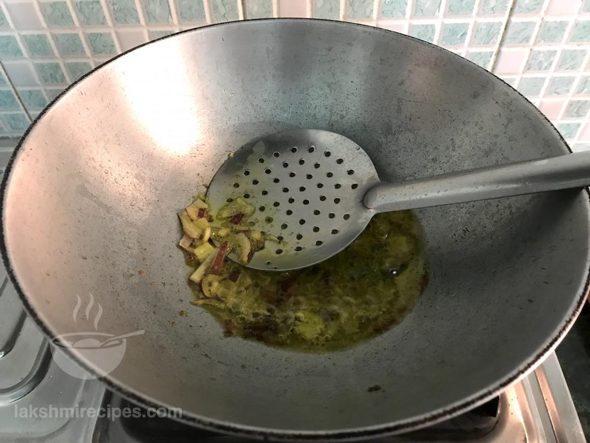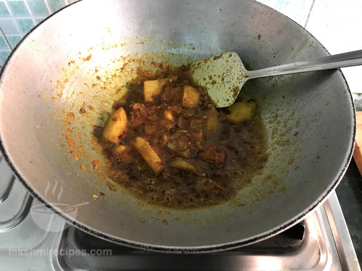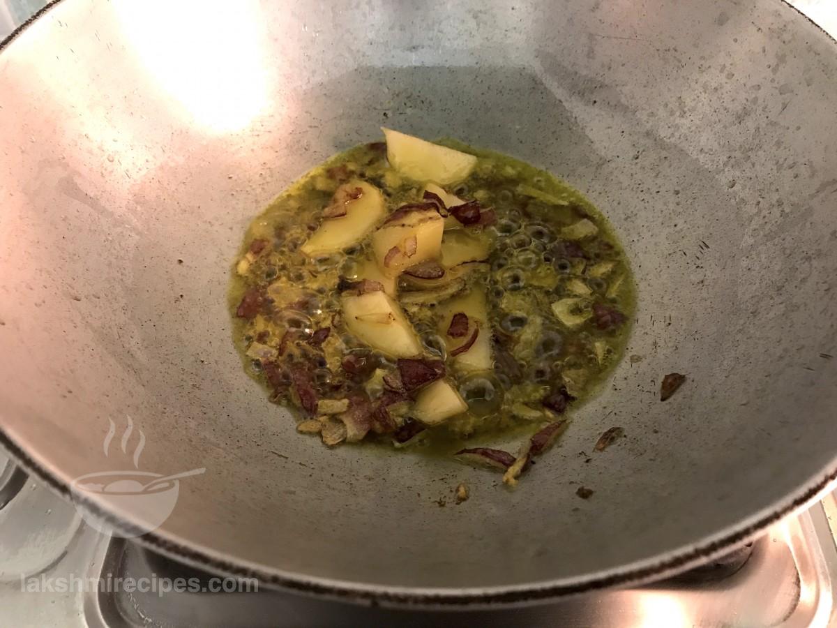 - फिर कढ़ाई में आलू के टुकड़े और कुटी हुई अदरक-लहसुन-हरी मिर्च का पेस्ट डालें। सामग्री को एक साथ चलाते हुए पकाएँ।