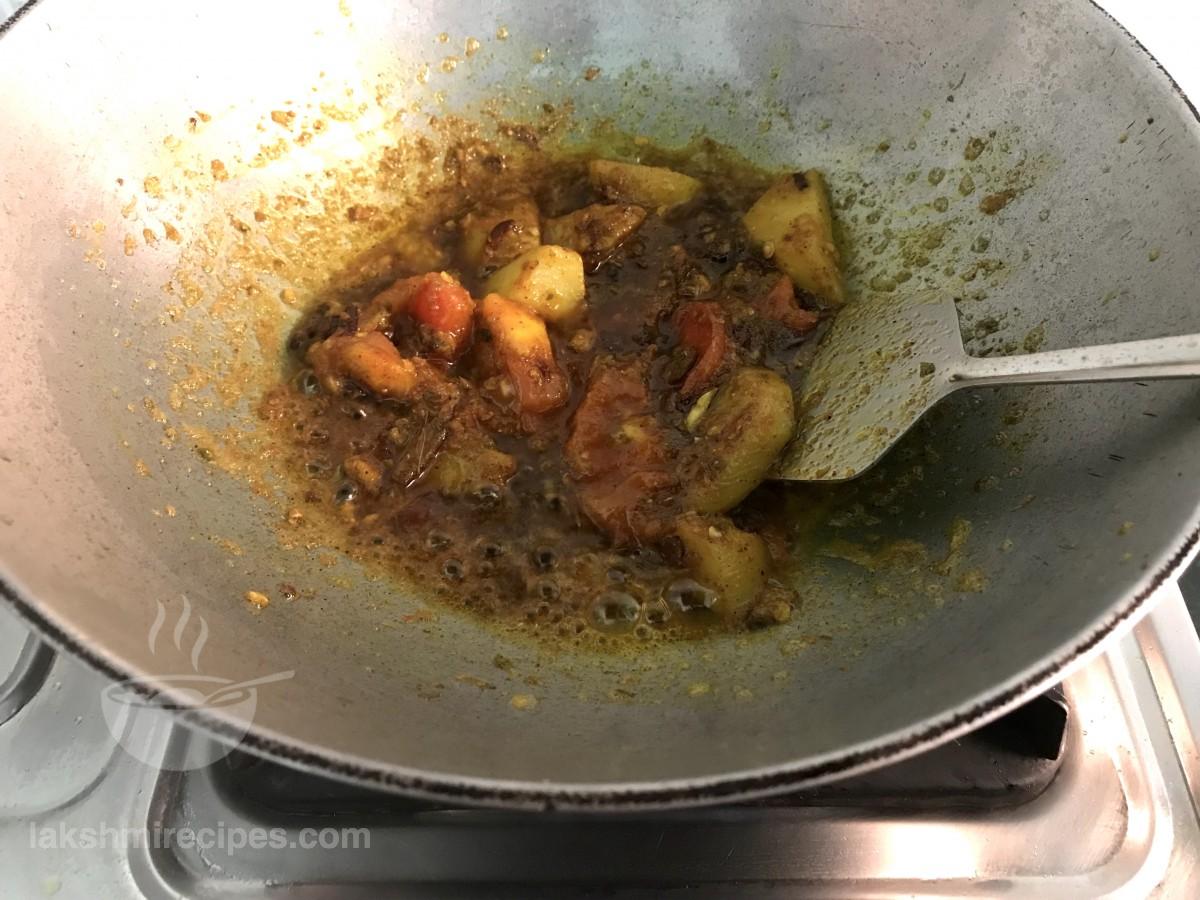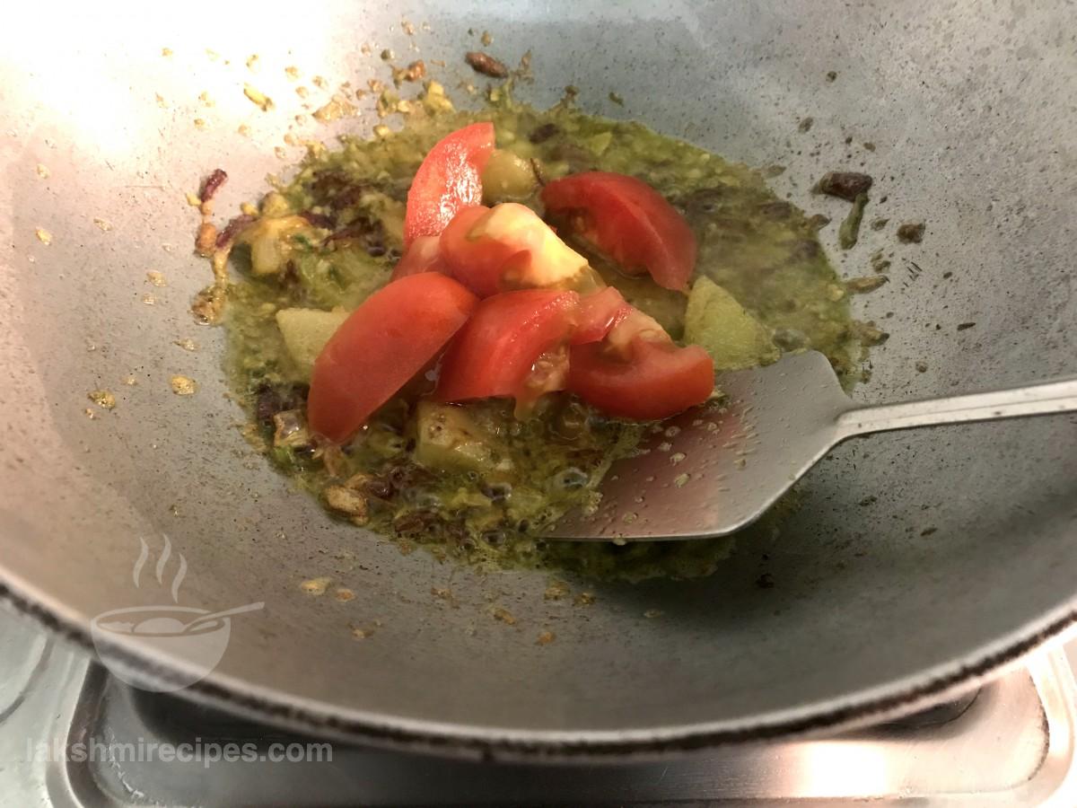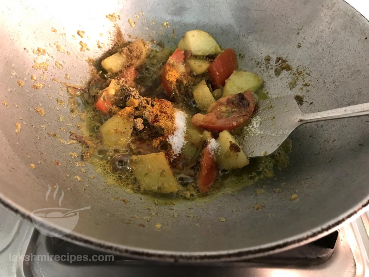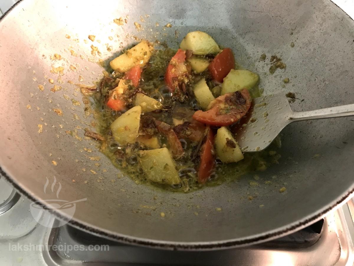 - When the potato pieces appear partially cooked then add chopped tomato to the kadhai. Stir nd cook the tomato pieces with all the ingredients.