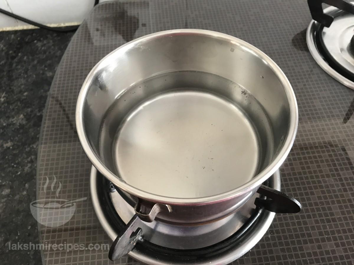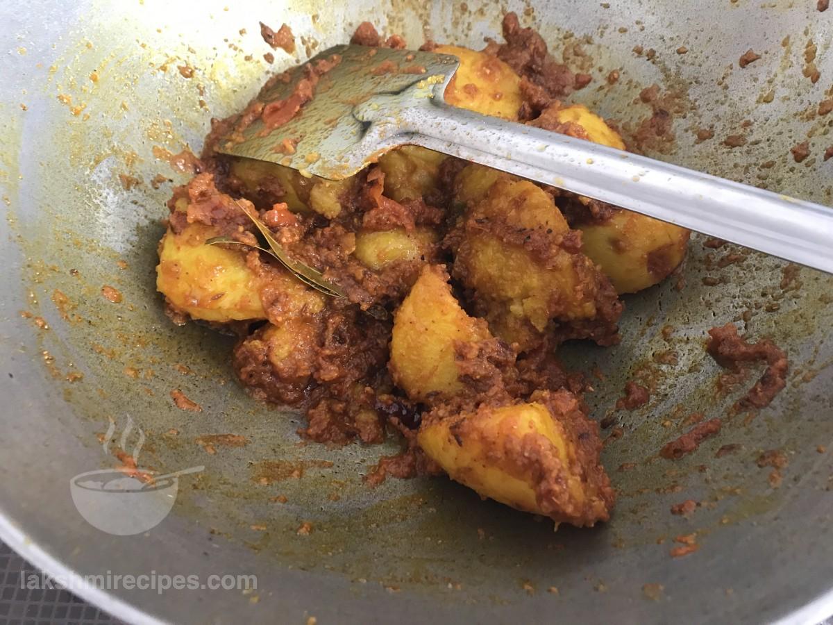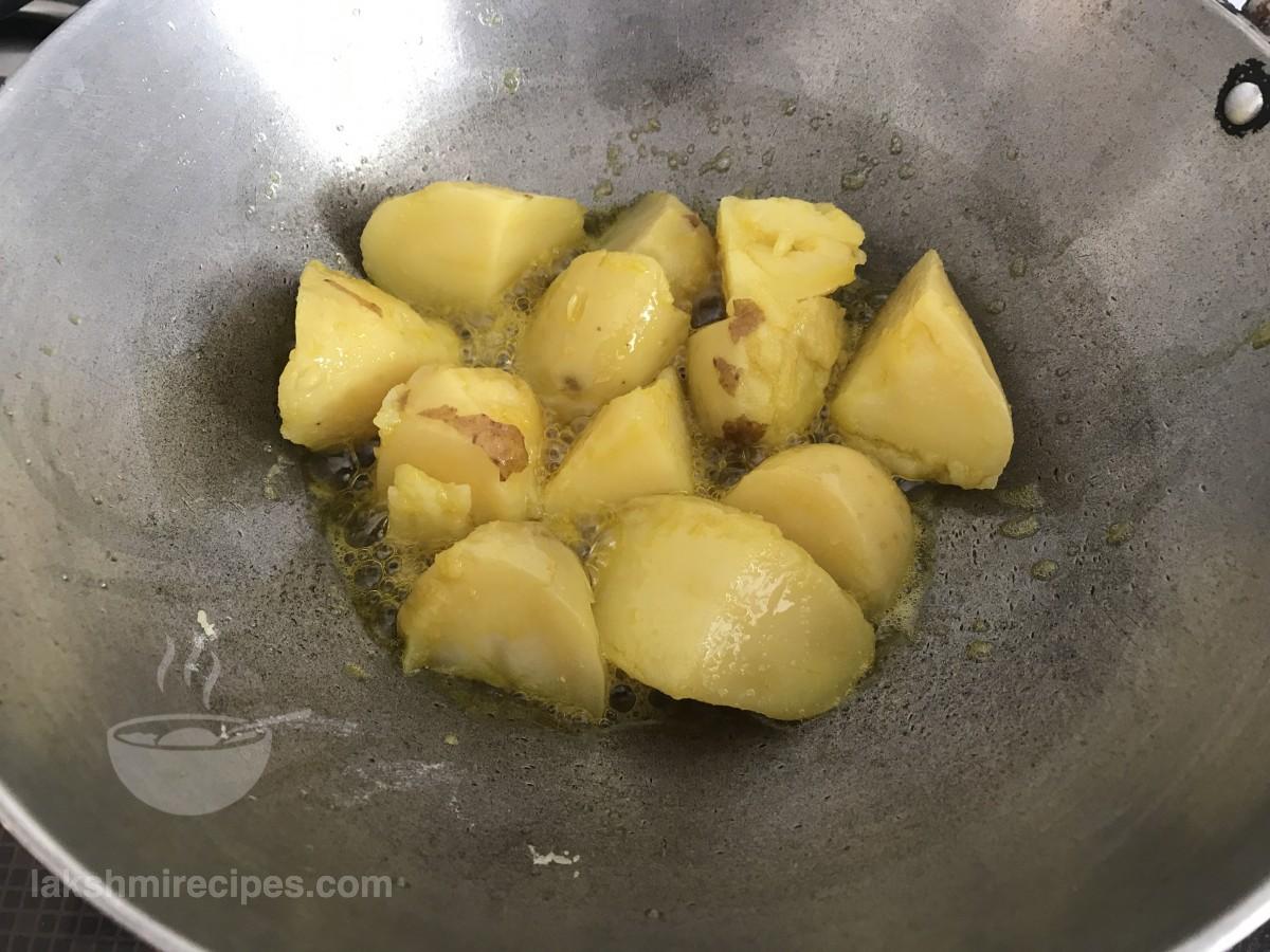 - Then add luke warm water to the kadhai for gravy. The amount of water should enough so that the potato pieces are submerged in it.