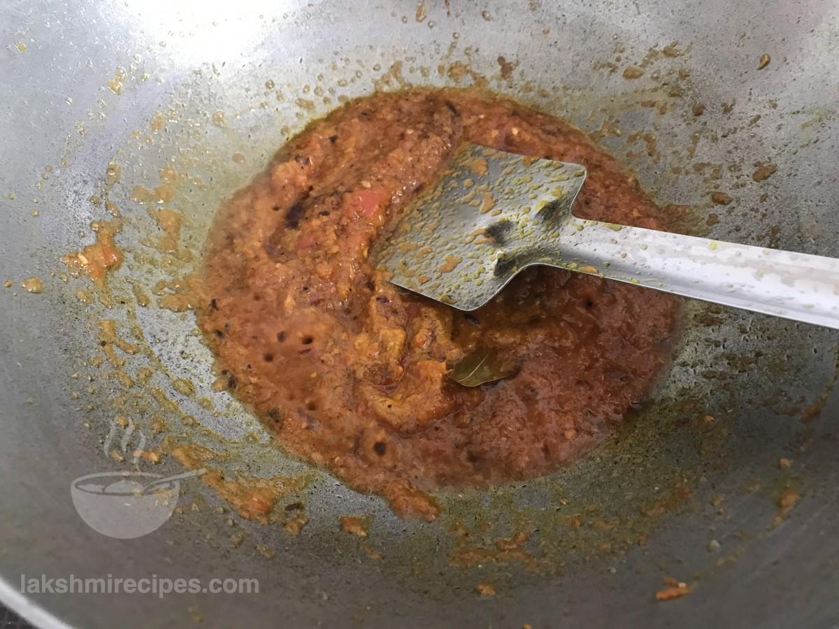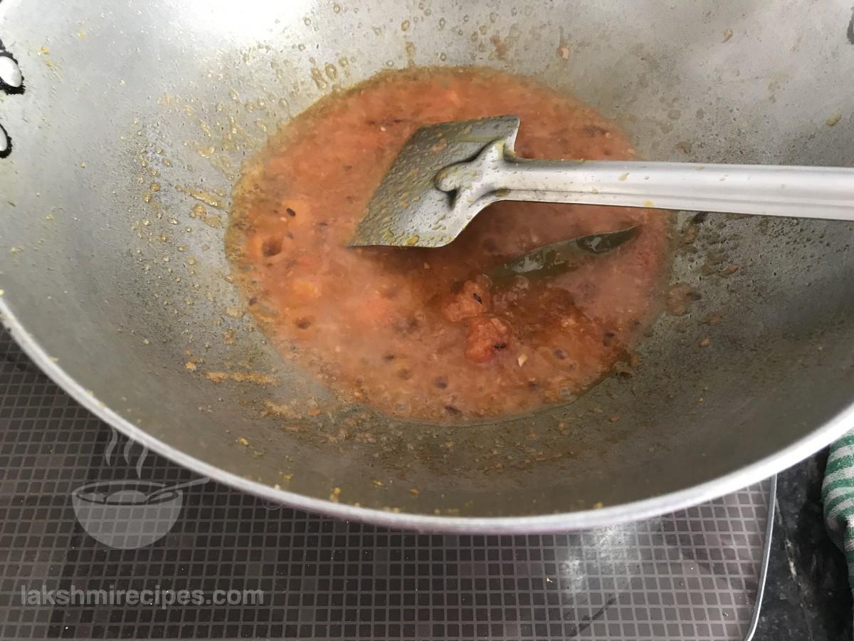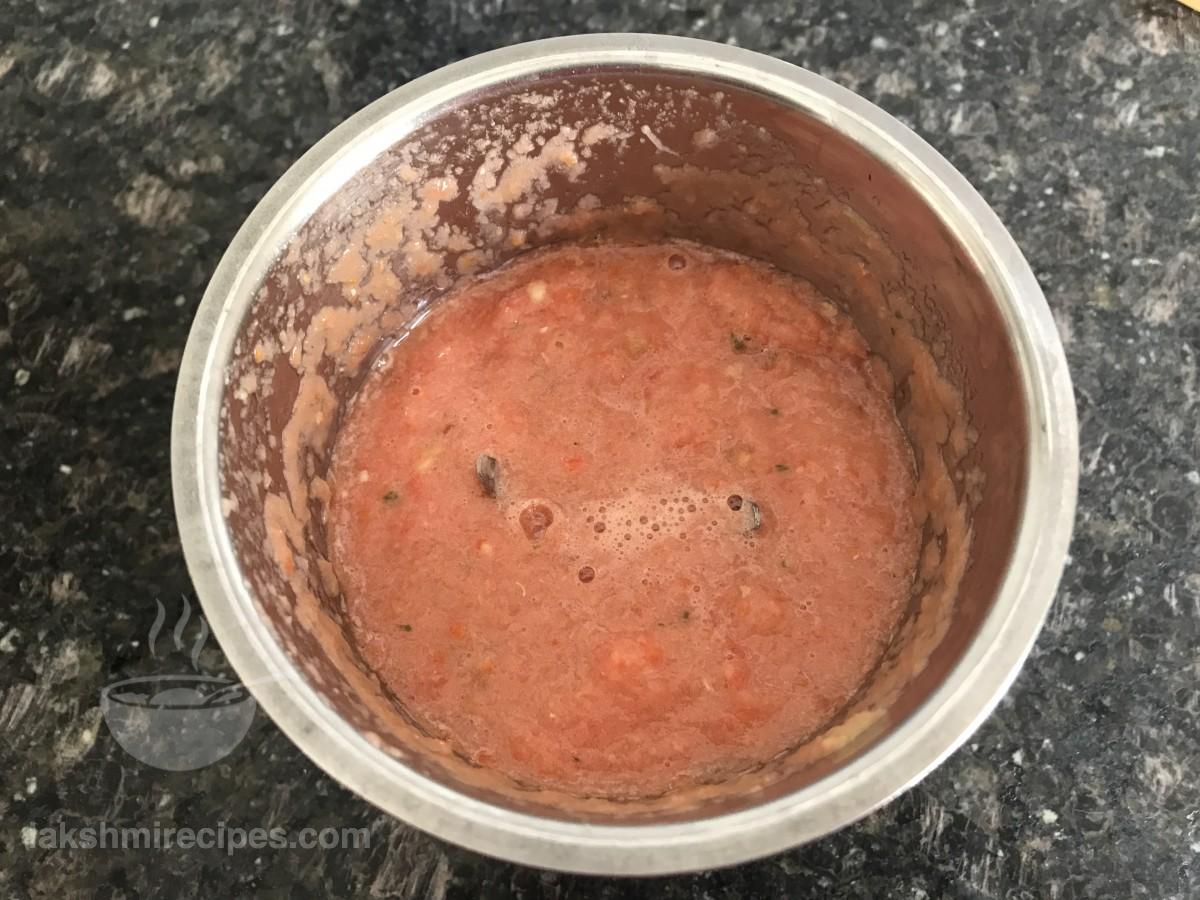 - 1-2 सेकंड के बाद कढ़ाई में टमाटर का पेस्ट (जो कि चरण 2 में तैयार किया गया था), उसको डालें और सामग्री को मिलाने केलिए चलाएं। टमाटर का पेस्ट को अन्य सामग्री के साथ मध्यम आँच पर पकाएं।