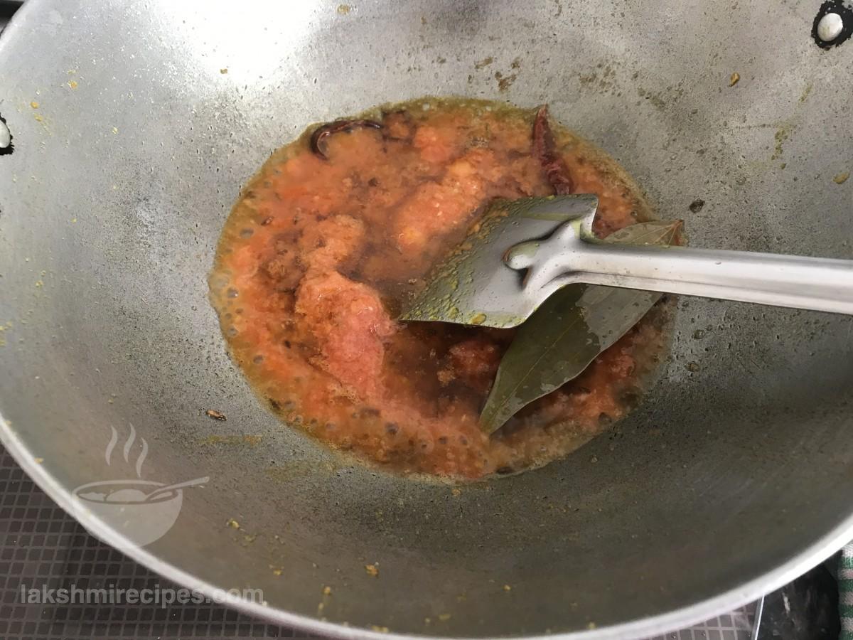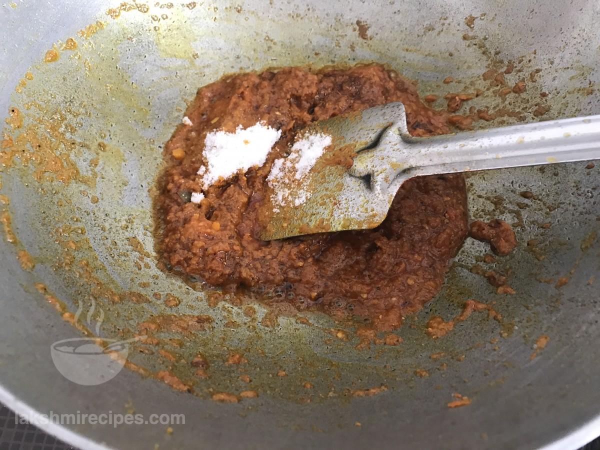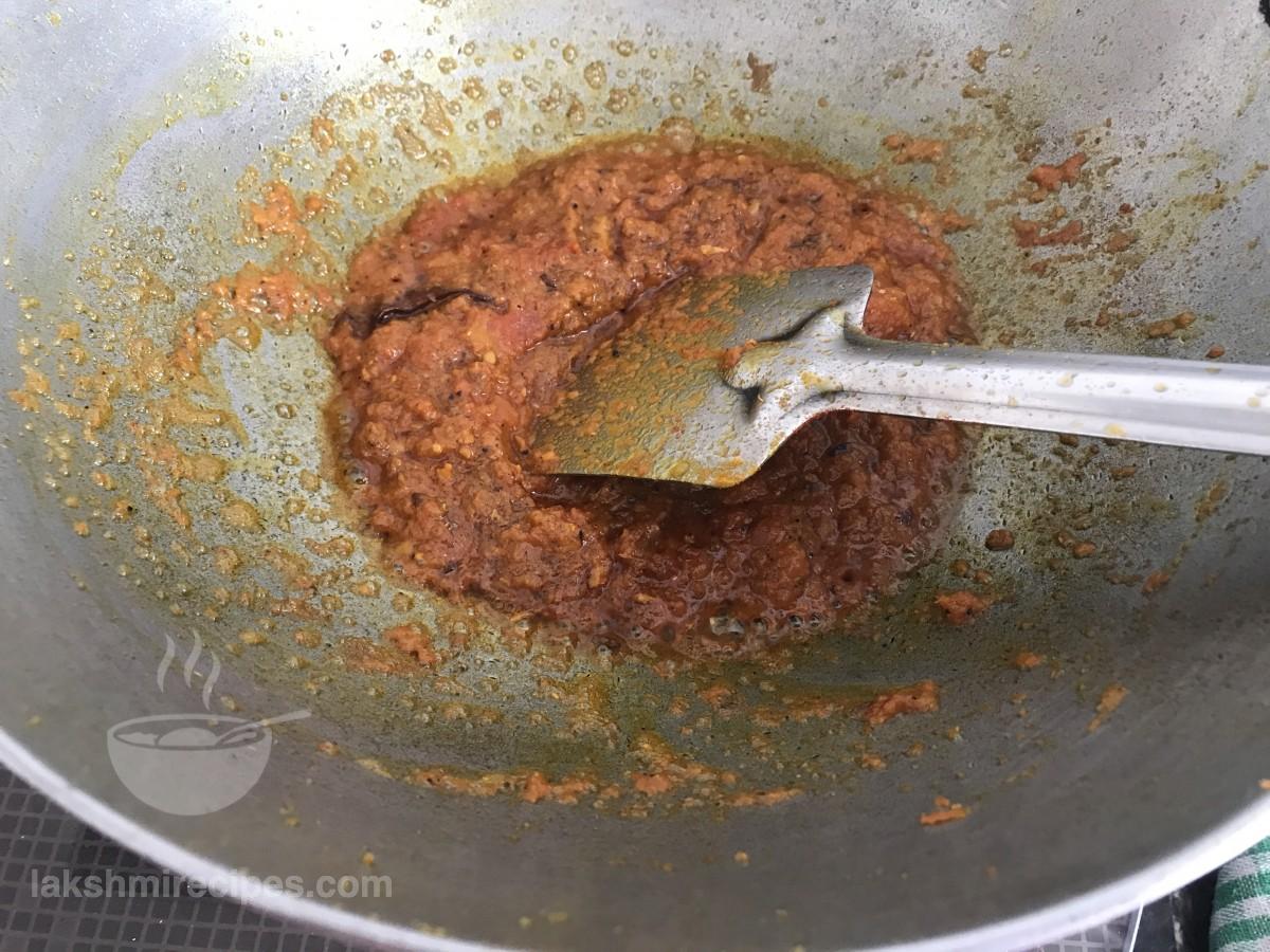 - 1-2 सेकंड के बाद कढ़ाई में टमाटर का पेस्ट (जो कि चरण 2 में तैयार किया गया था), उसको डालें और सामग्री को मिलाने केलिए चलाएं। टमाटर का पेस्ट को अन्य सामग्री के साथ मध्यम आँच पर पकाएं।