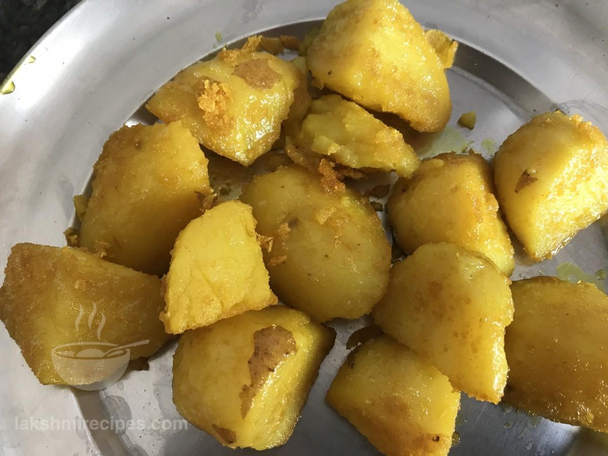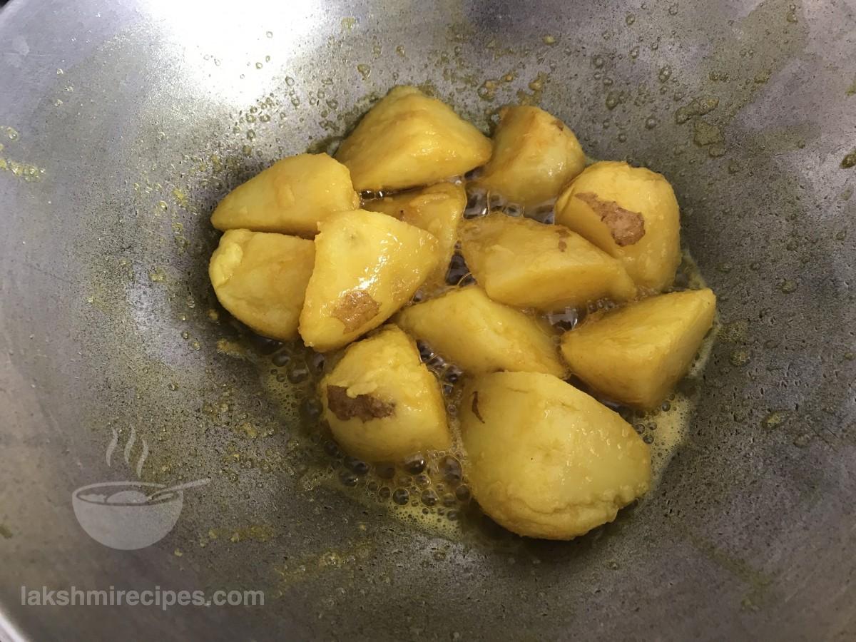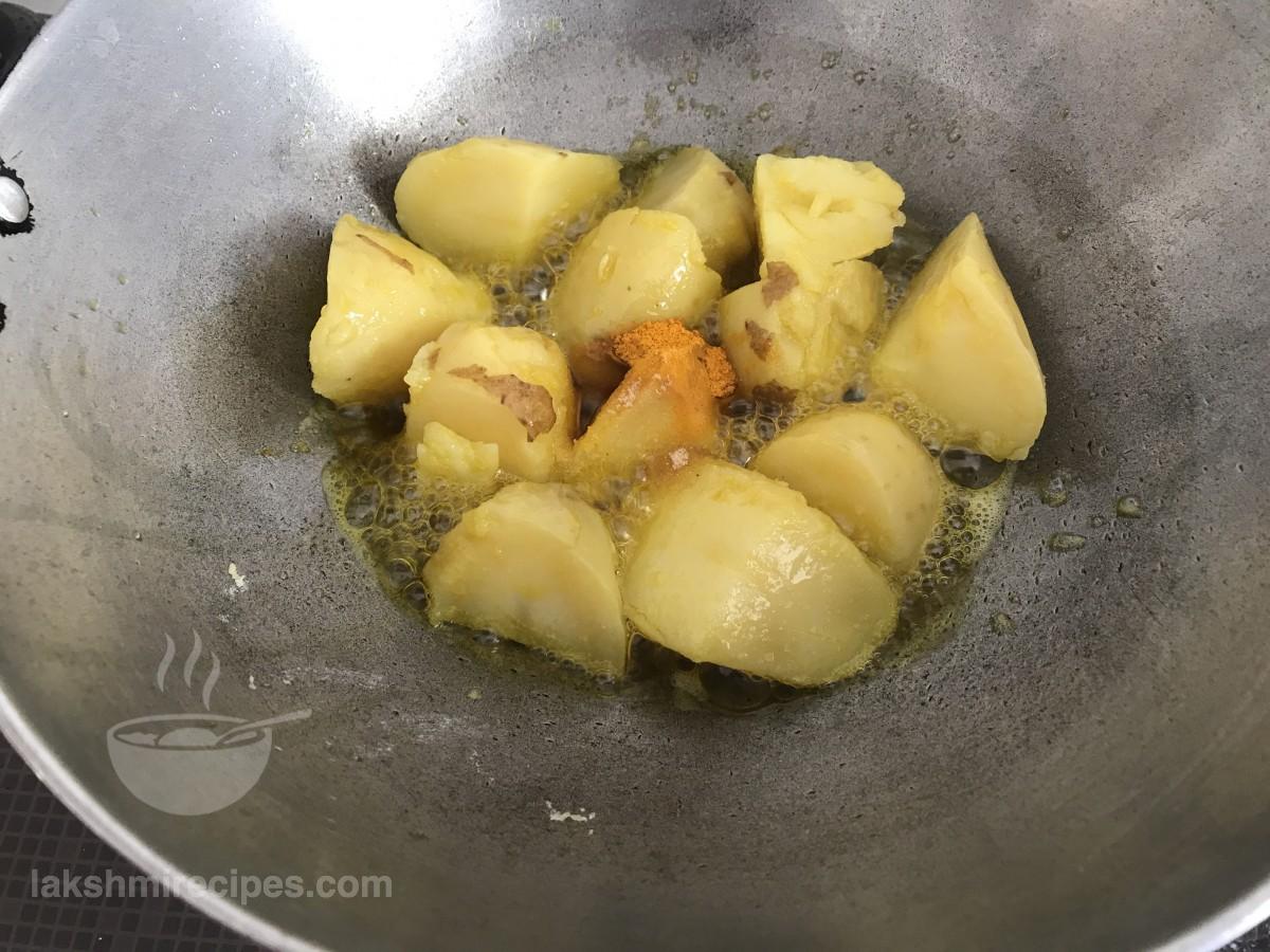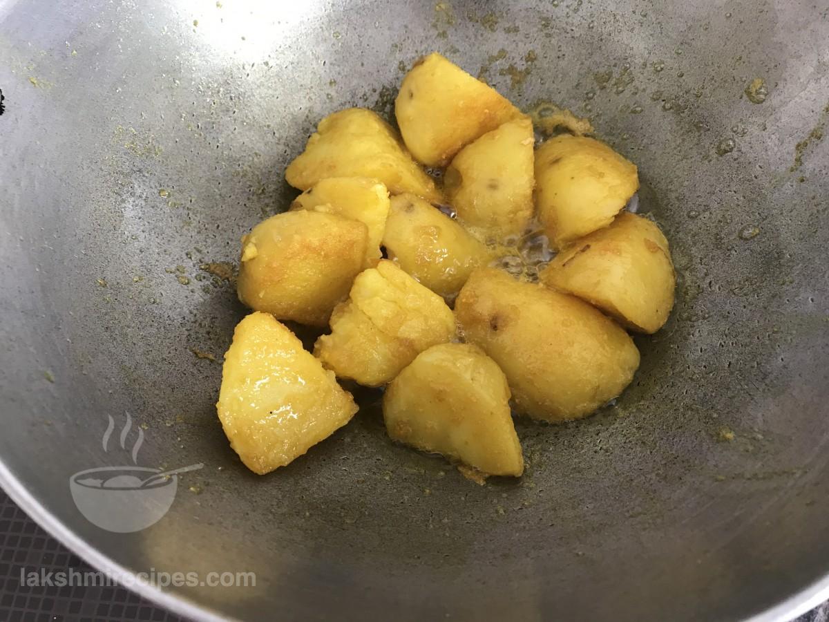 - Then add turmeric powder and 1-2 pinch salt to it. Stir to mix the ingredients well. Cook the potato pieces till they appear cooked and reddish golden in color. Then transfer the cooked pieces of boiled potato to a plate to be used later.