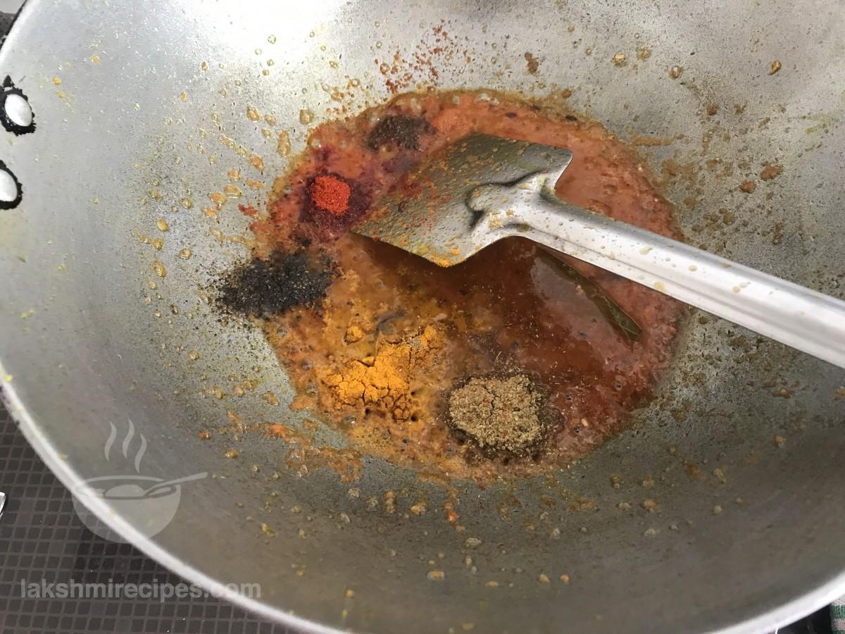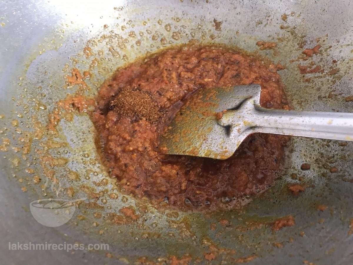 - When the spices are cooked and the oil begins to seperate from the cooking ingredients, then add garam masala powder to the cooking ingredients and mix well.