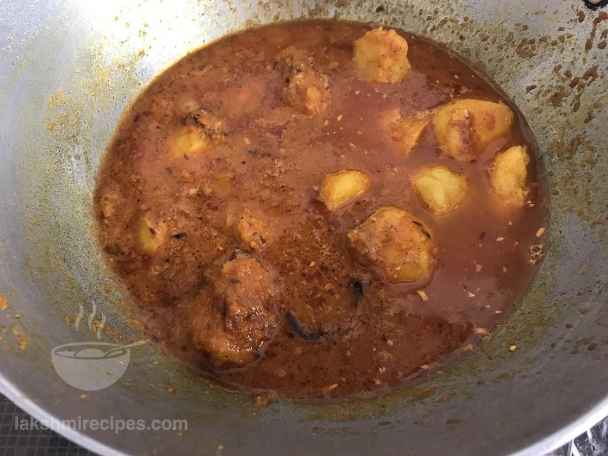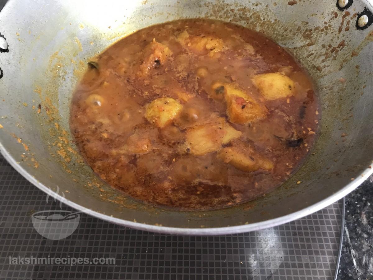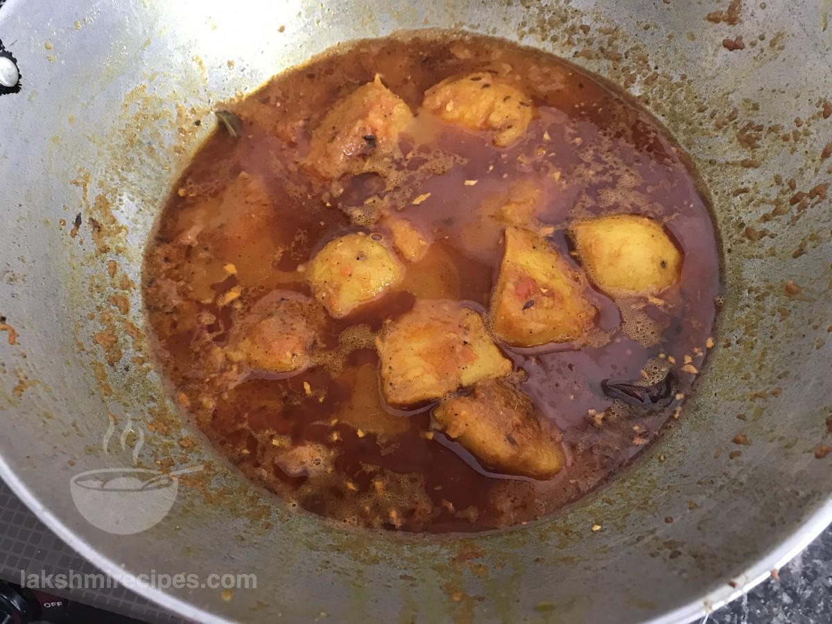 - कढ़ाई को ढक्कन के साथ कवर करें और 5 मिनट के लिए मध्यम-कम आँच पर आलू दम करी को पकने दें।