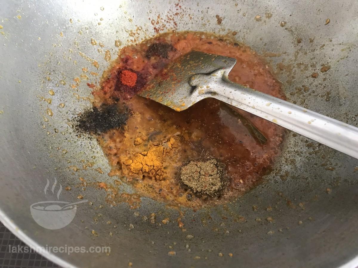 - Then add turmeric powder, red chilli powder, cumin seeds powder, black pepper powder and coriander powder to the cooking ingredients. Stir to mix well.