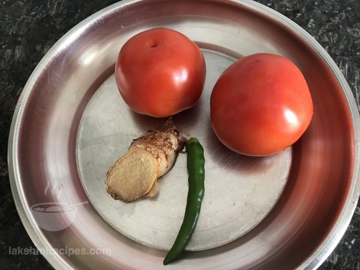 - Now add tomato, ginger and green chilli to a mixer jar to make a fine paste.